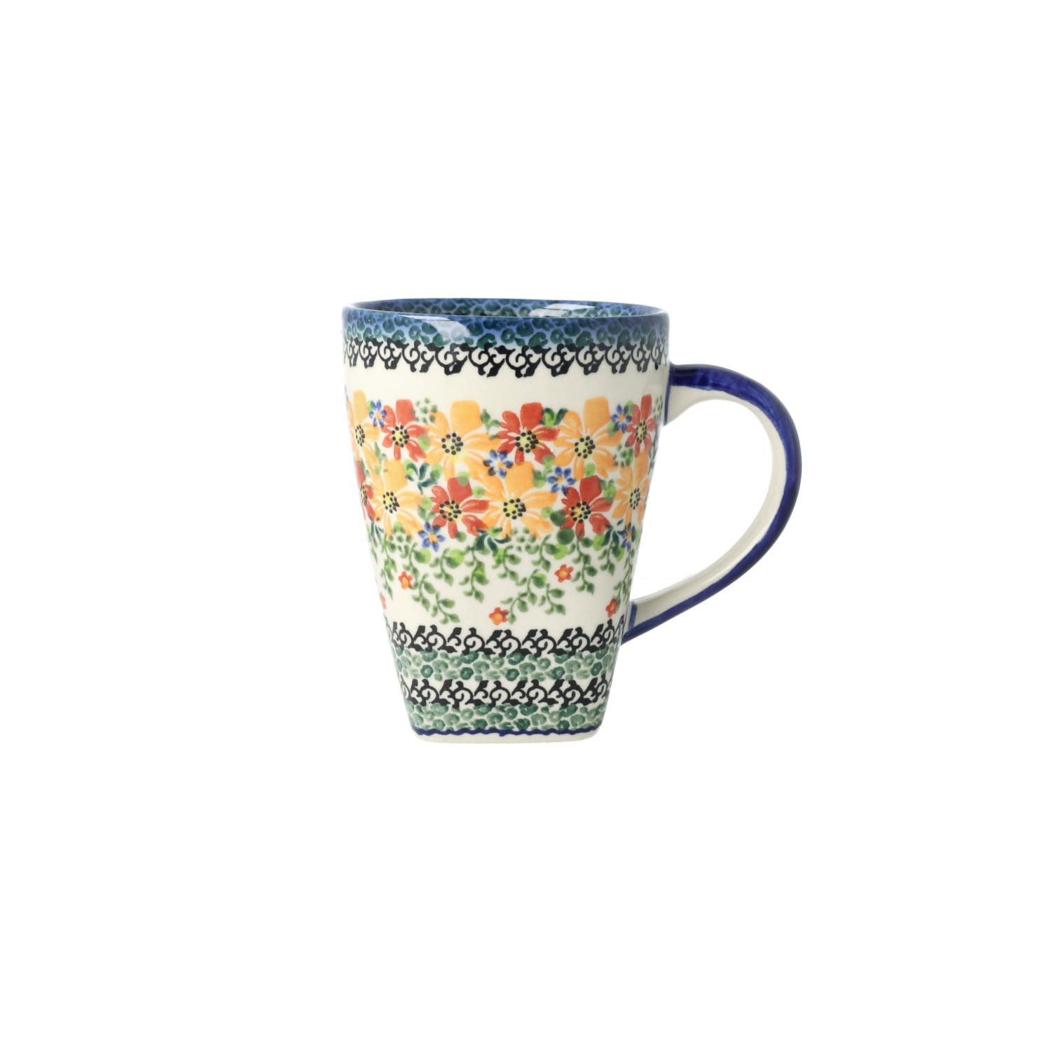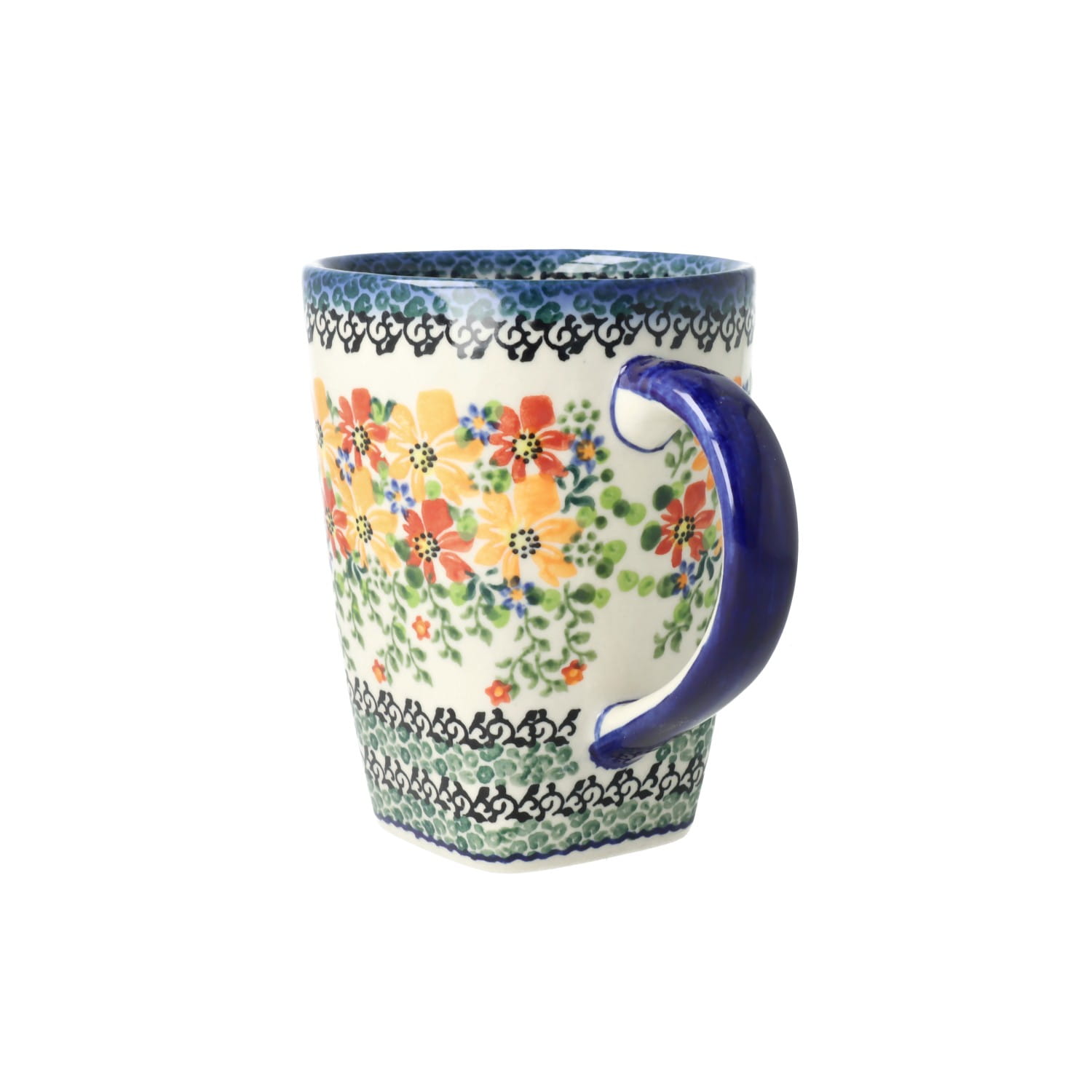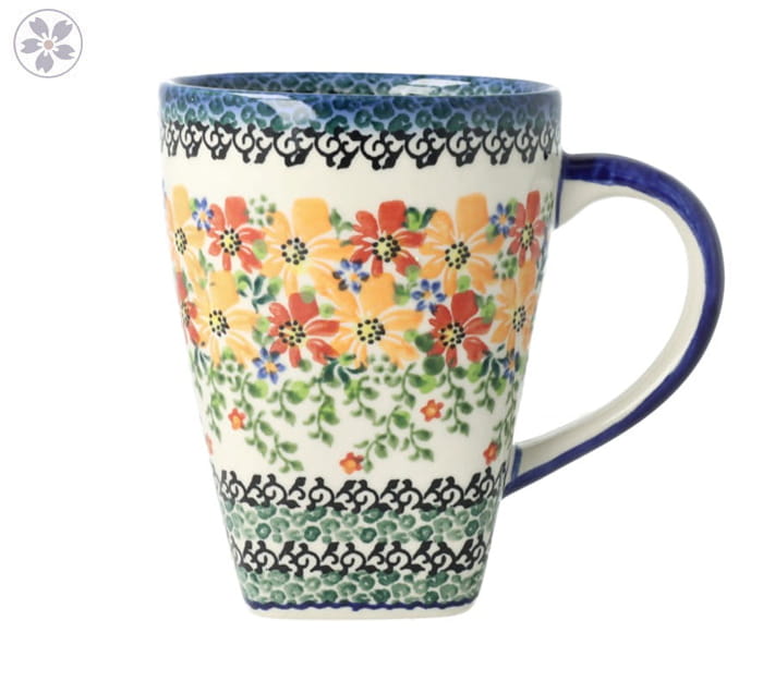 Kubek z profilowanym uchem. Produkt ręcznie formowany i dekorowany w Ceramice Artystycznej S.R.A. Bolesławiec.