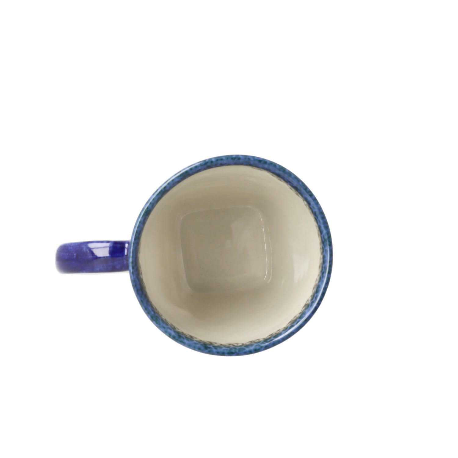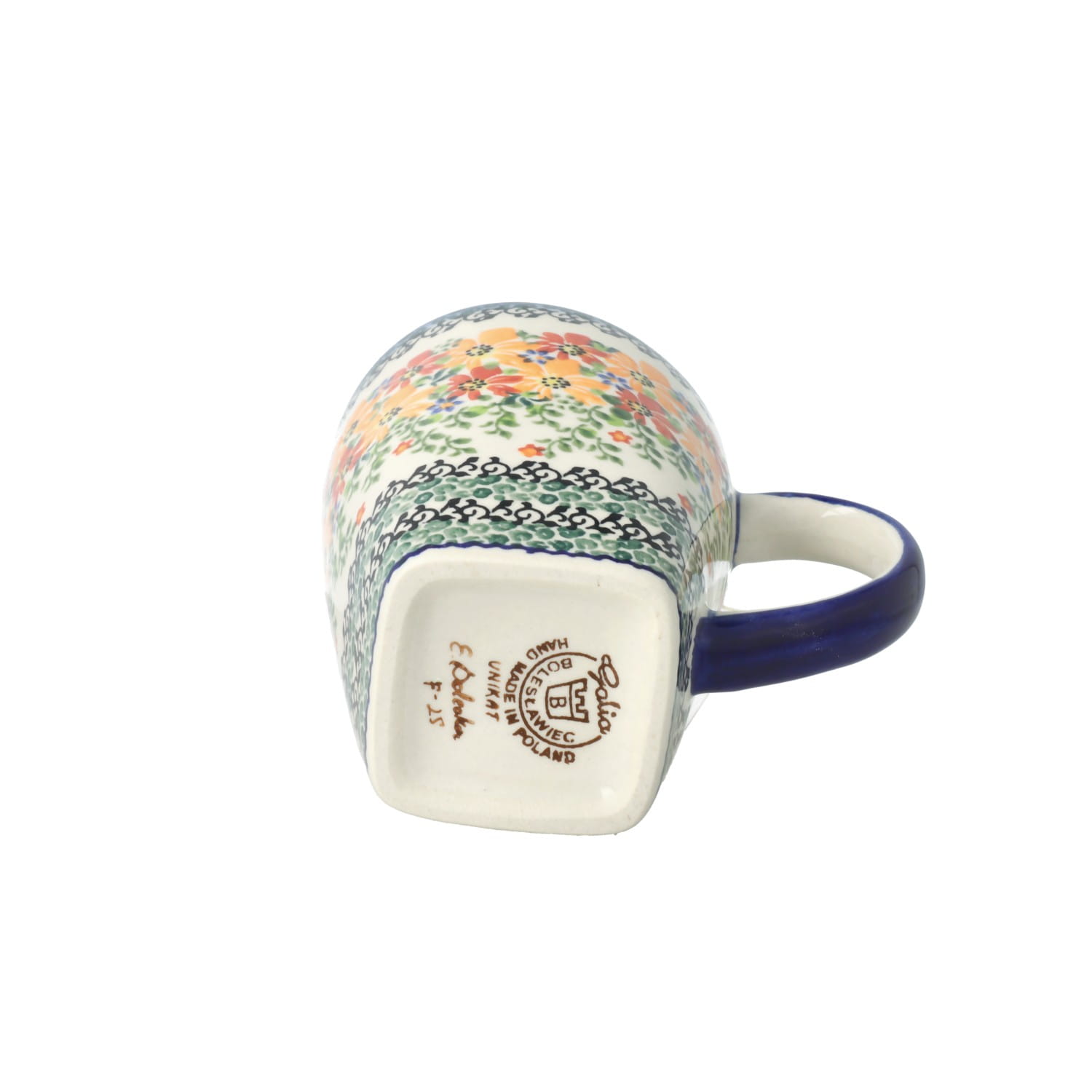Kubek z uchem, w klasycznym kształcie. Produkt ręcznie formowany i dekorowany w Manufakturze Galia Bolesławiec.