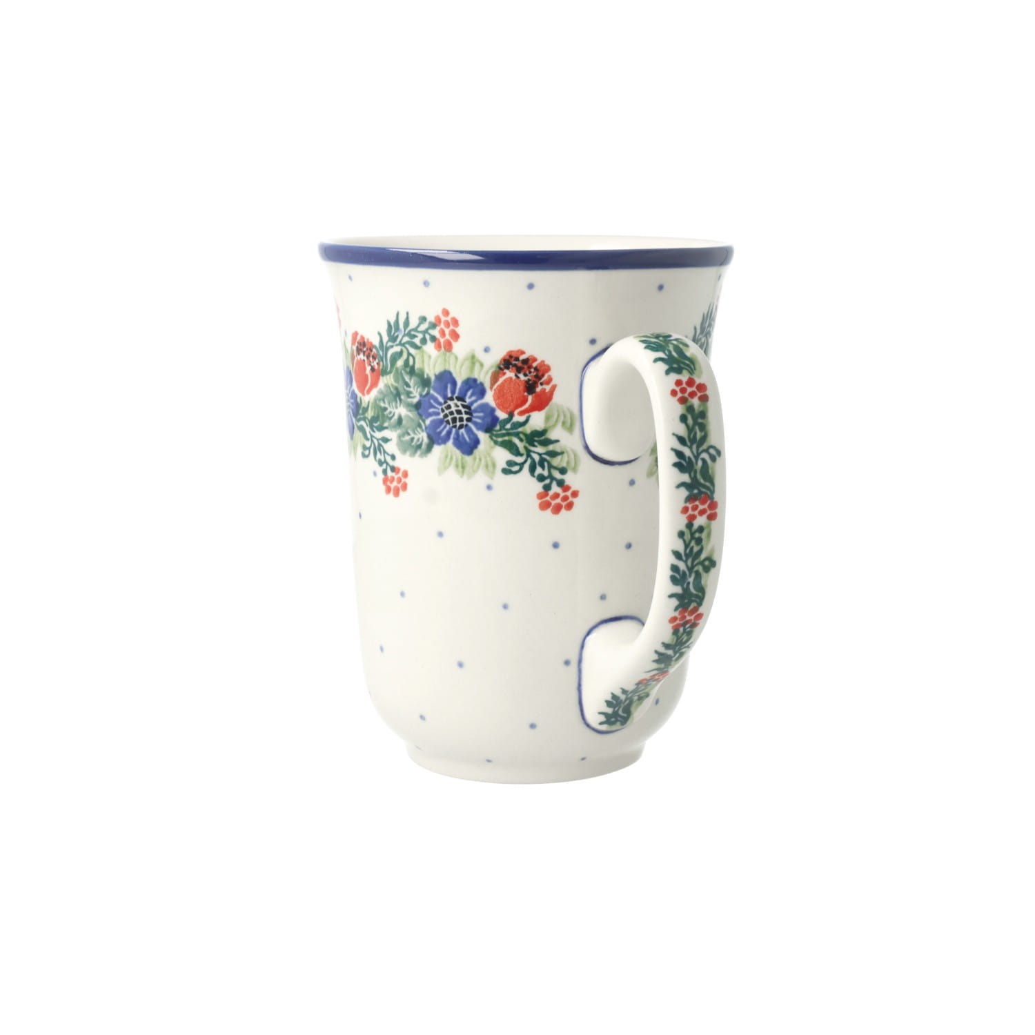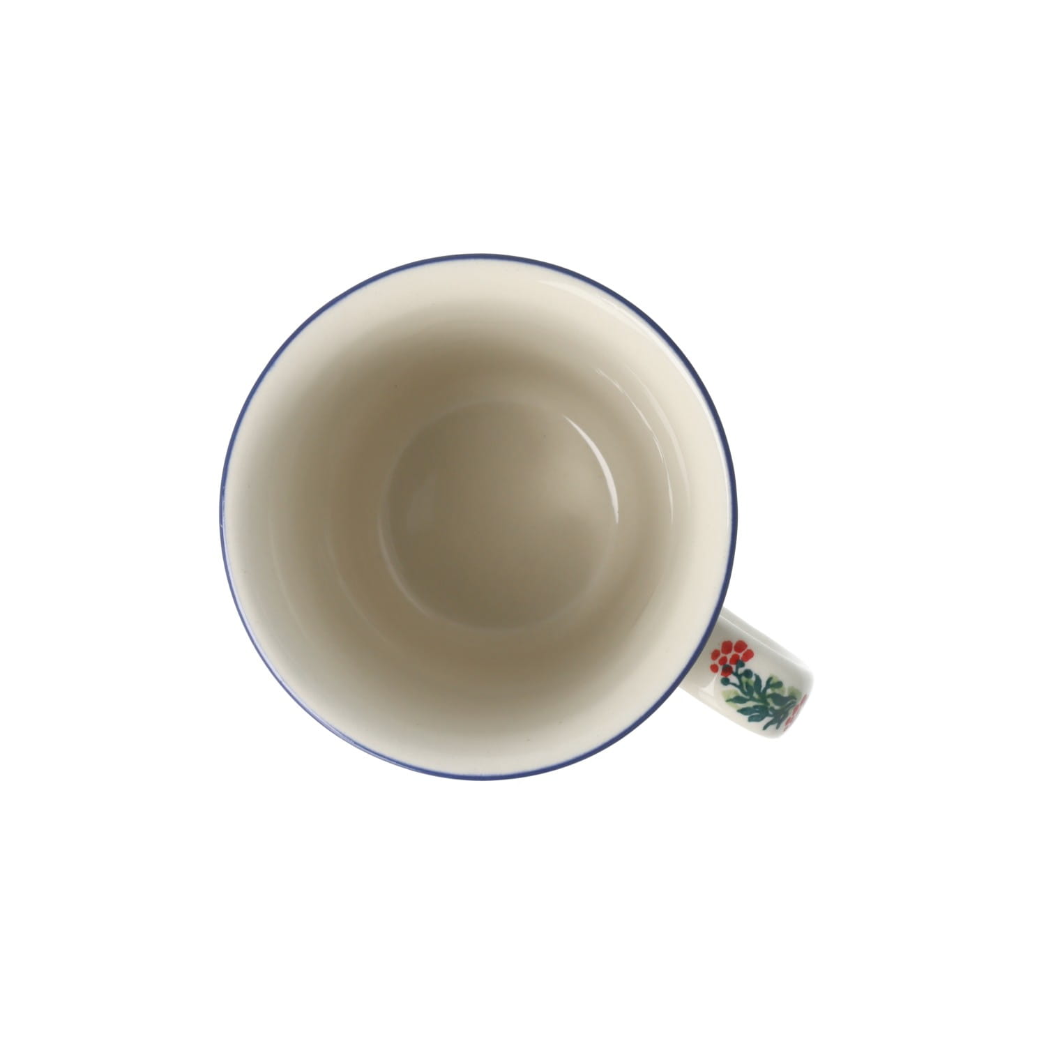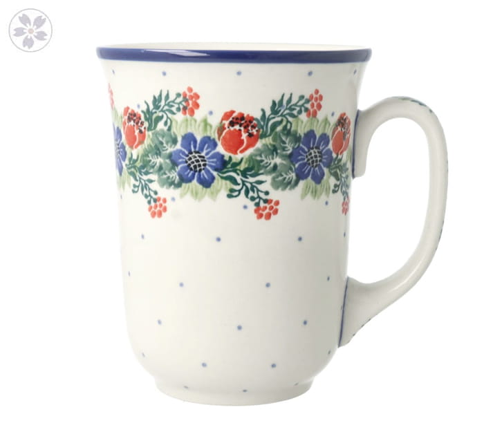 Klasyczny kubek z profilowanym uchem. Produkt ręcznie formowany i dekorowany w Ceramice Artystycznej S.R.A. Bolesławiec.