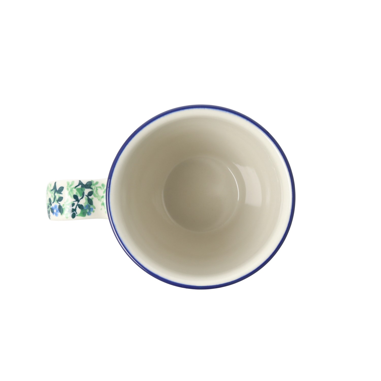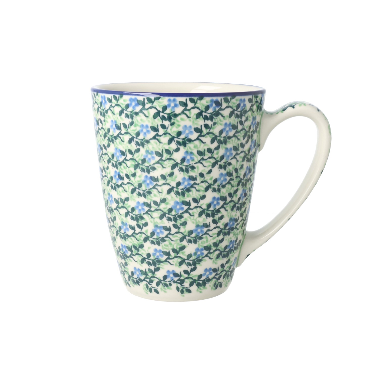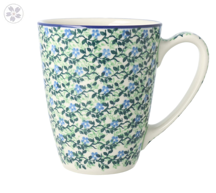 Kubek z motywem zielonych kwiató. Produkt ręcznie formowany i dekorowany w Manufakturze Galia Bolesławiec.