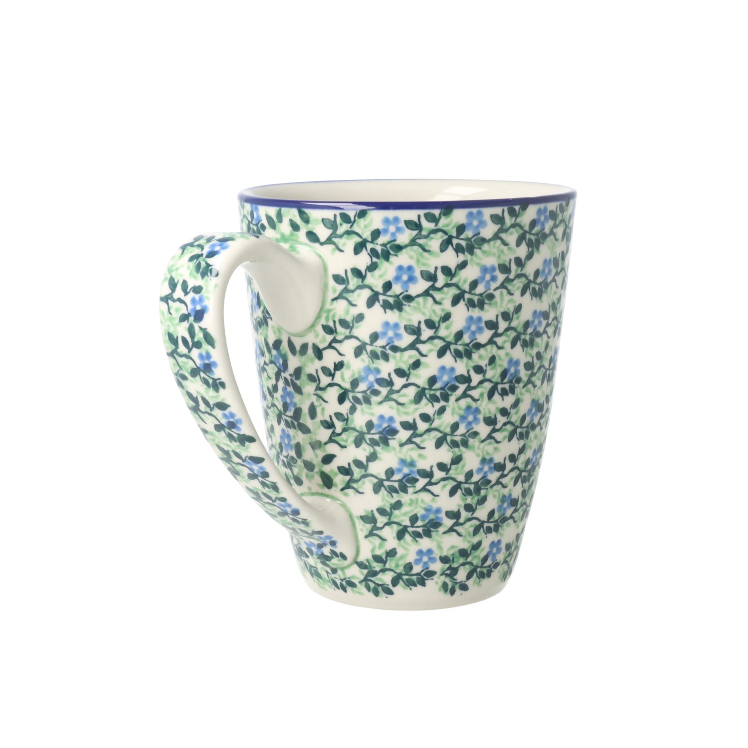 Klasyczny kubek z profilowanym uchem. Produkt ręcznie formowany i dekorowany w Ceramice Artystycznej S.R.A. Bolesławiec.