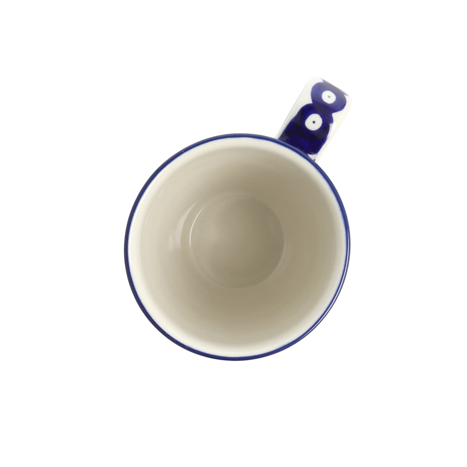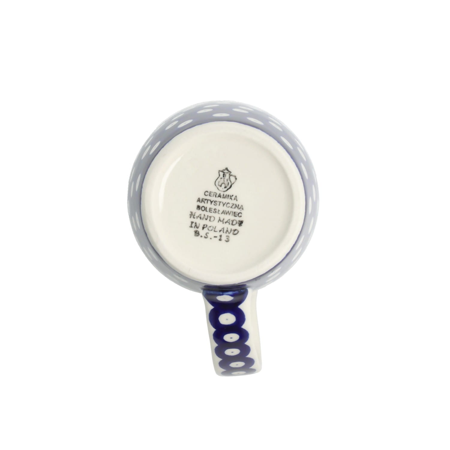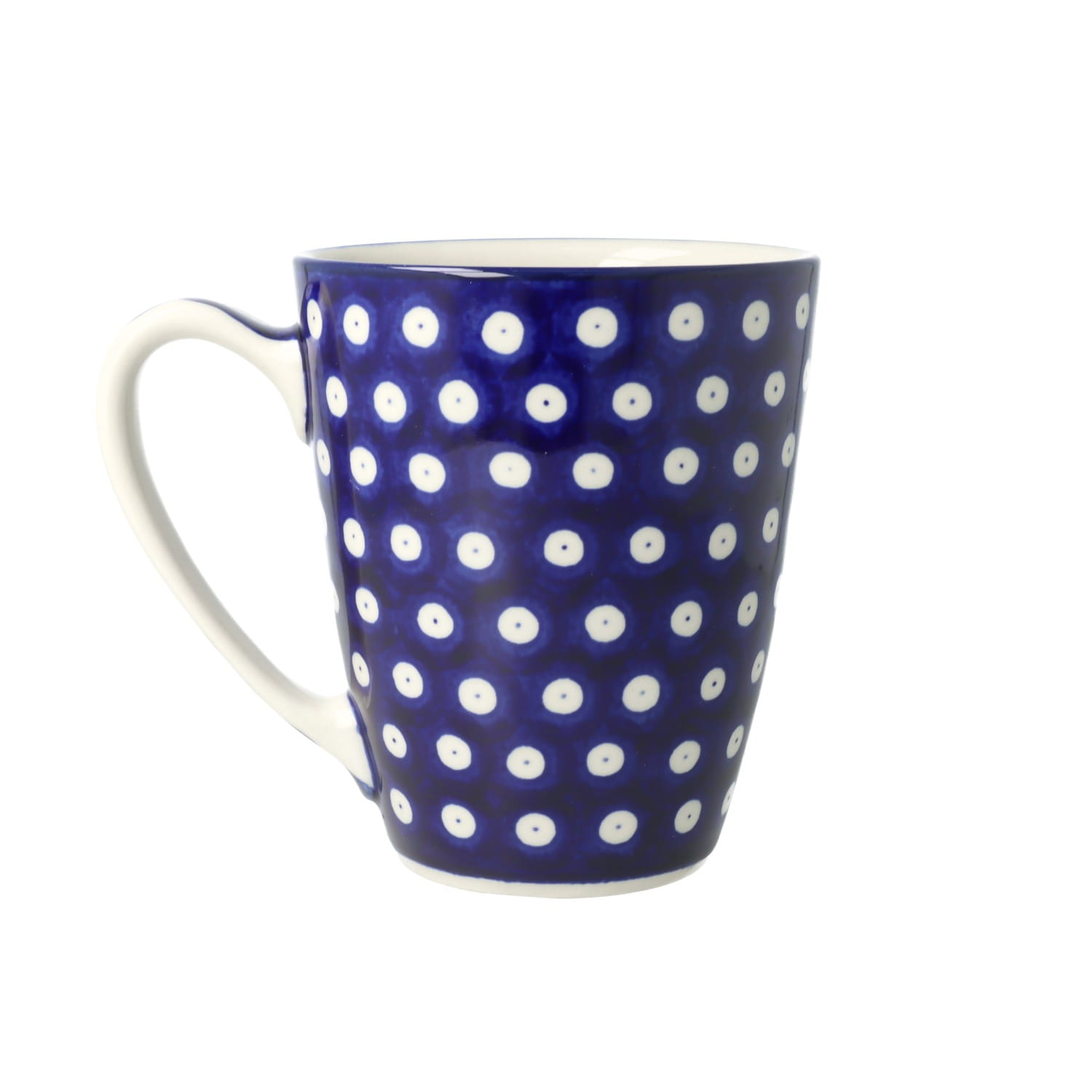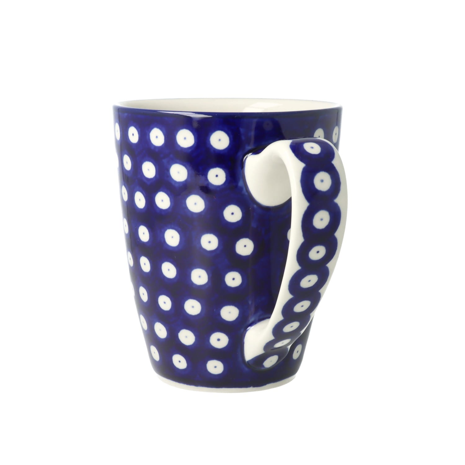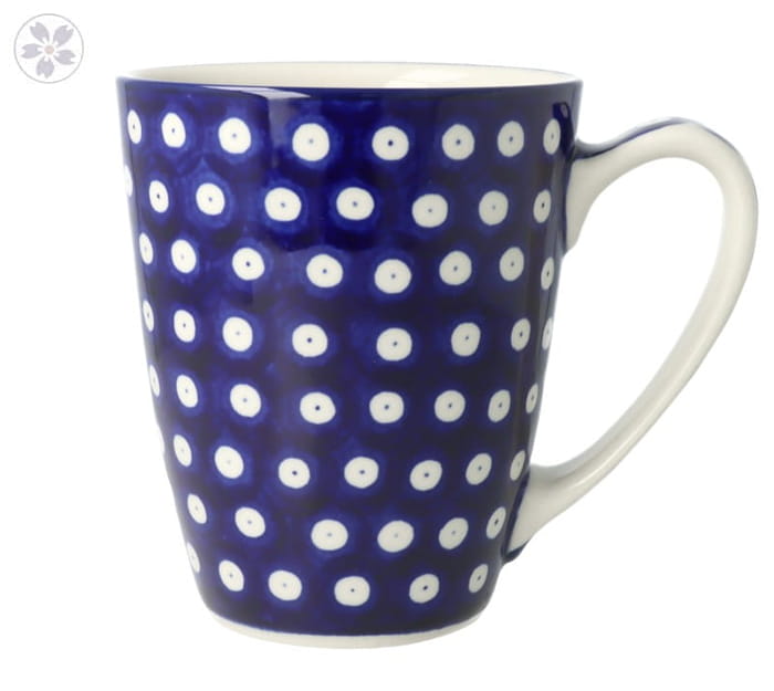 Klasyczny kubek z profilowanym uchem. Produkt ręcznie formowany i dekorowany w Ceramice Artystycznej S.R.A. Bolesławiec.