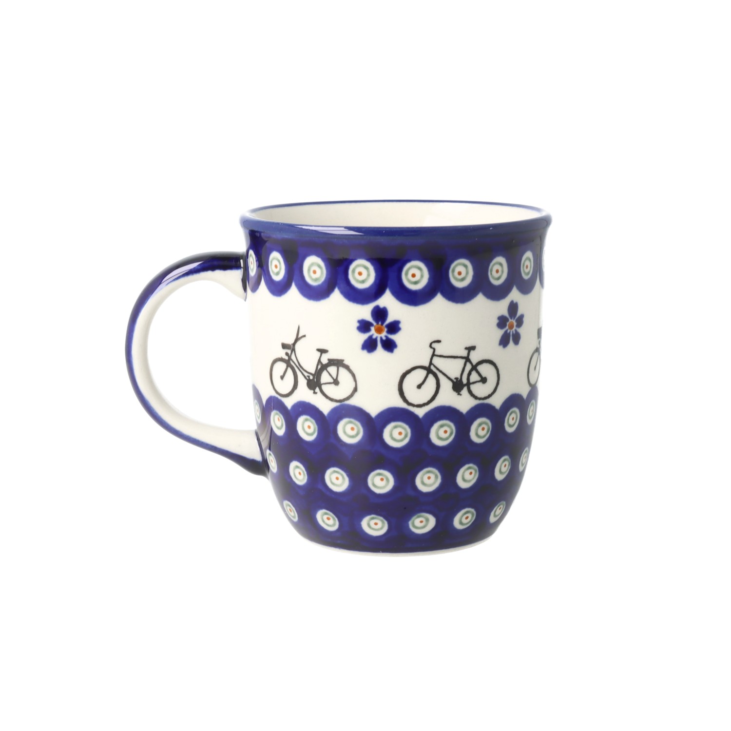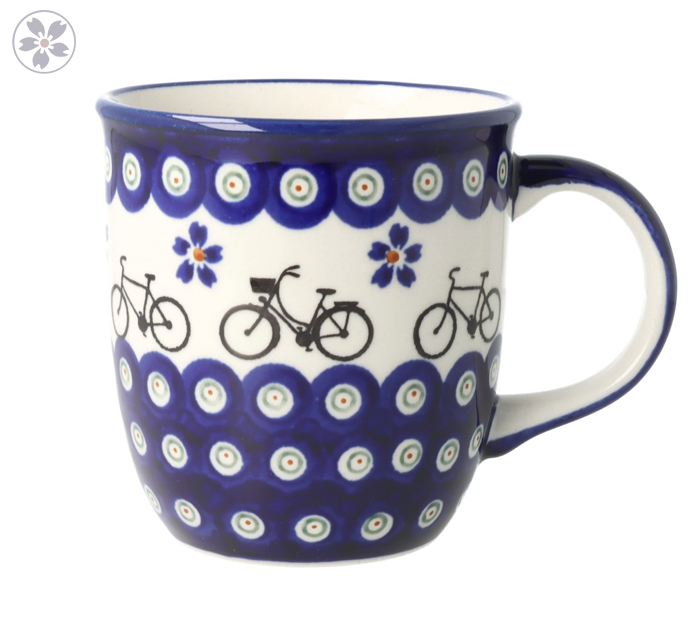 Kubek klasyczny i bardzo wygodny w użytkowaniu. Posiada wyprofilowany brzeg, ma unikatowy kształt który będzie wspaniale prezentować się w pomieszczeniu nowoczesnym jak i klasycznym. To wspaniały prezent i unikatowe uzupełnienie kolekcji. Wzór z motywem roweru i dekoracji numer 166A stanowi limitowaną edycję wzorów Ceramiki Bolesławiec.