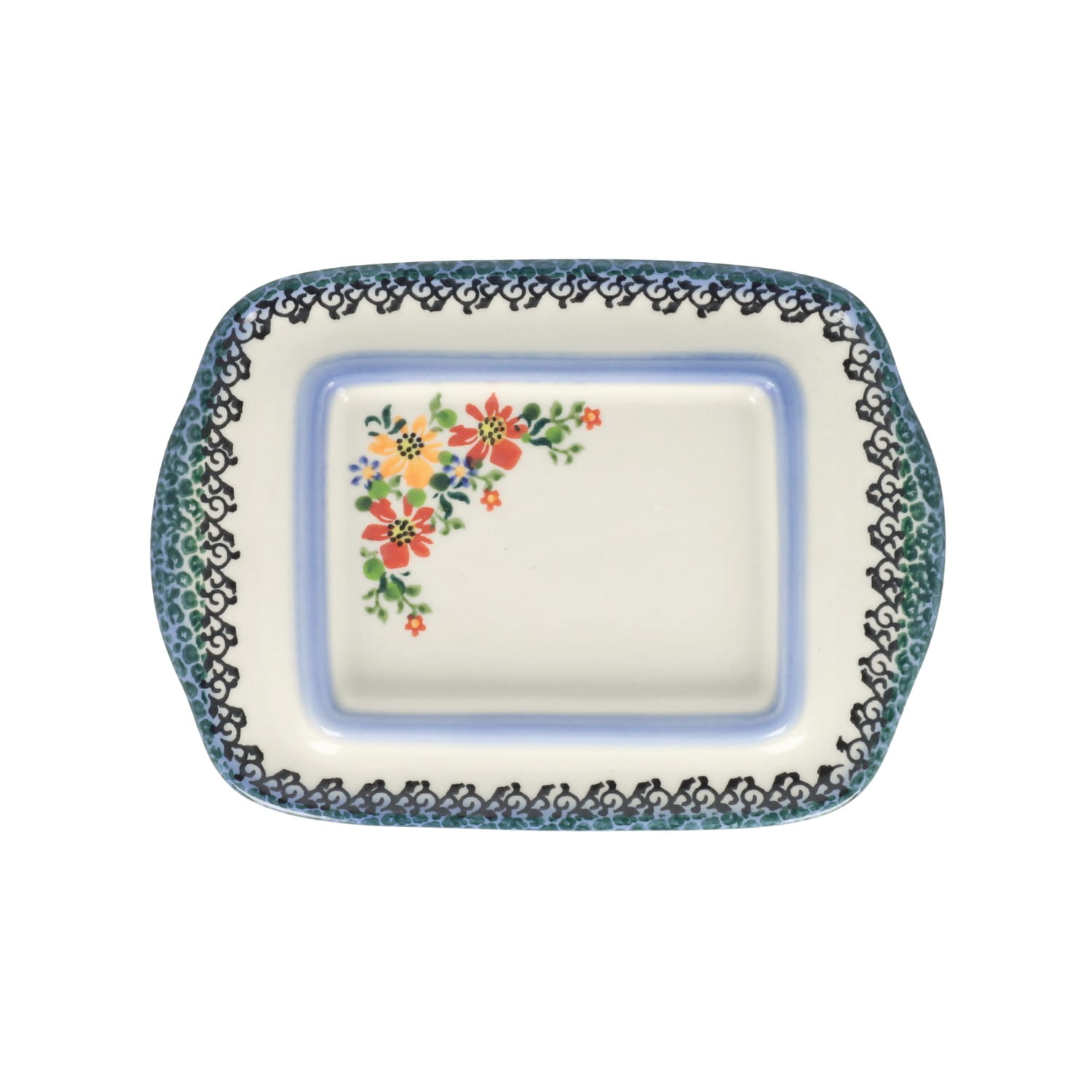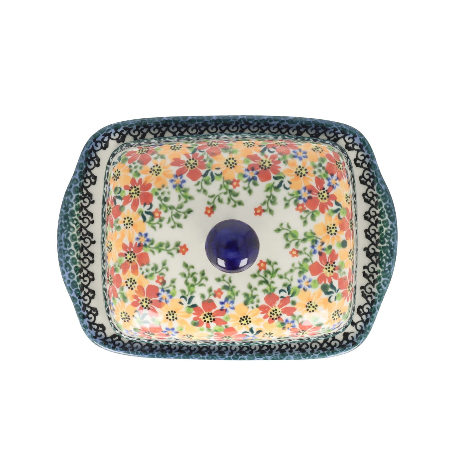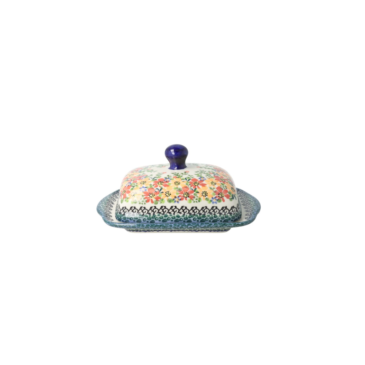 Ceramiczna maselnica z pokrywką z motywem kwiatów.