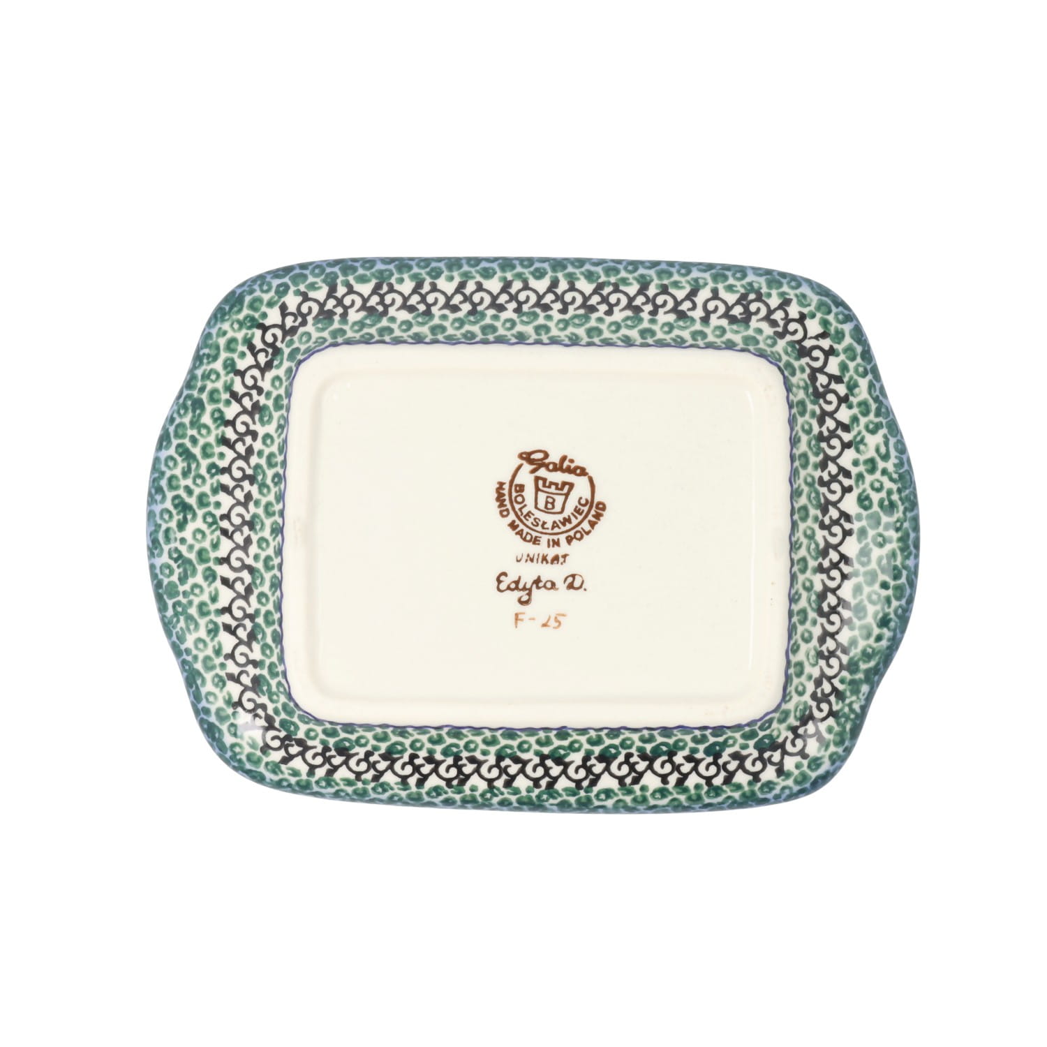 Naczynia w tym wzorze dekorowane są ręcznie, za pomocą stempli i pędzla, są podpisane przez artystę.