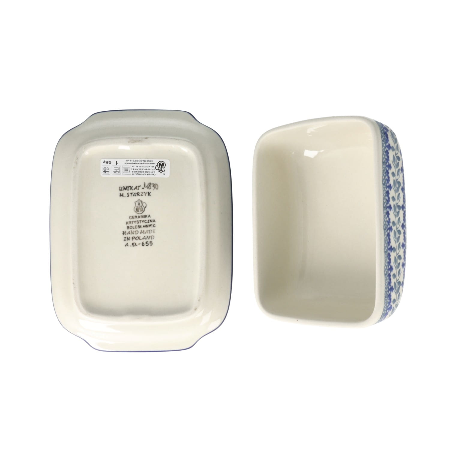 Prostokątna forma do pieczenia z uchwytami. Produkt ręcznie formowany i dekorowany w Ceramice Artystycznej S.R.A. Bolesławiec.