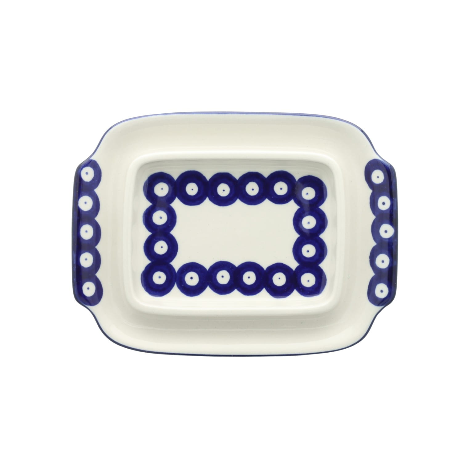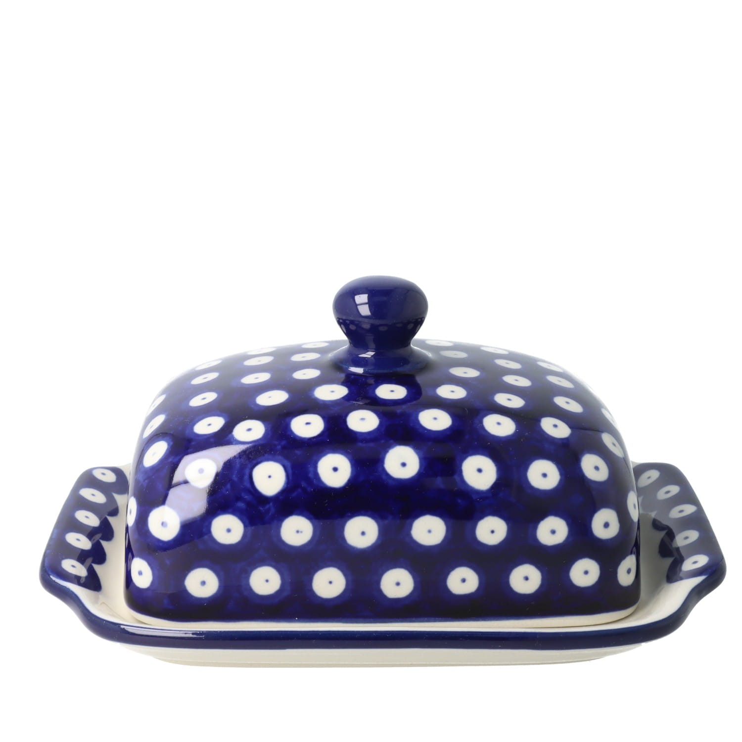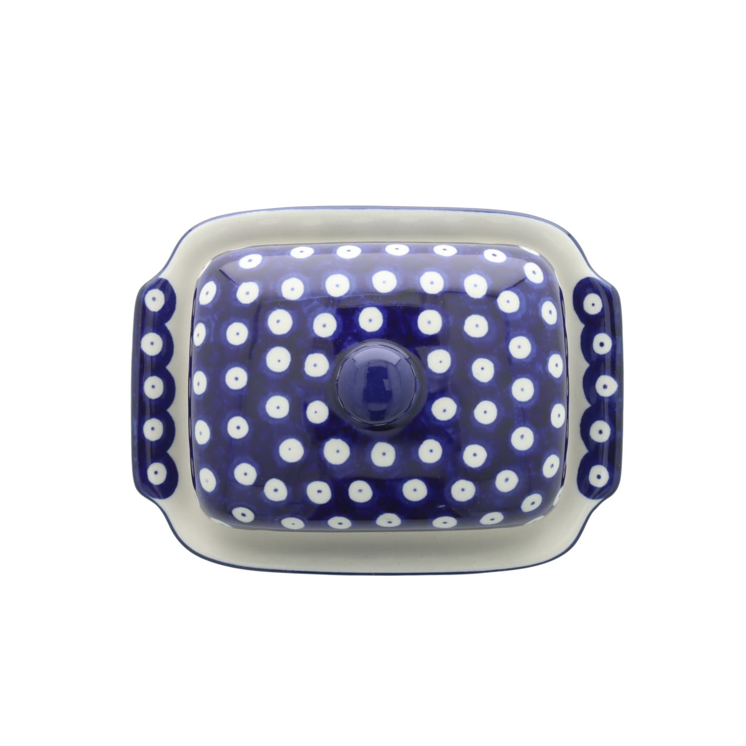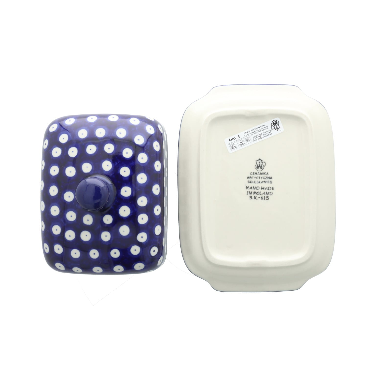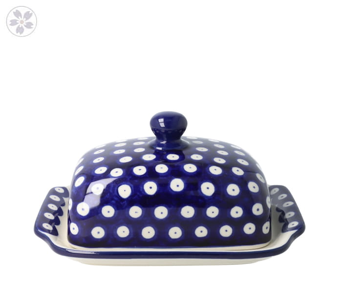 Maselnica z pokrywą, pomieści całą kostkę masła. Produkt ręcznie formowany i dekorowany w Ceramice Artystycznej S.R.A. Bolesławiec.