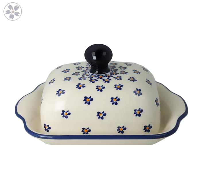 Mała maselnica na pół kostki masła. Produkt ręcznie formowany i dekorowany w Zakładach Ceramicznych Bolesławiec.