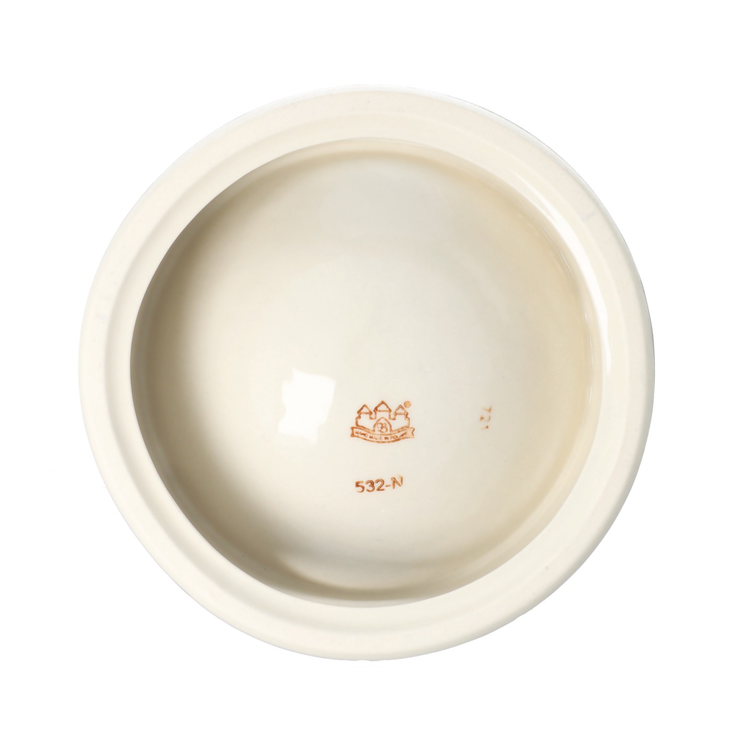 Okrągła bigośnica z pokrywką. Produkt ręcznie formowany i dekorowany w Zakładach Ceramicznych Bolesławiec.