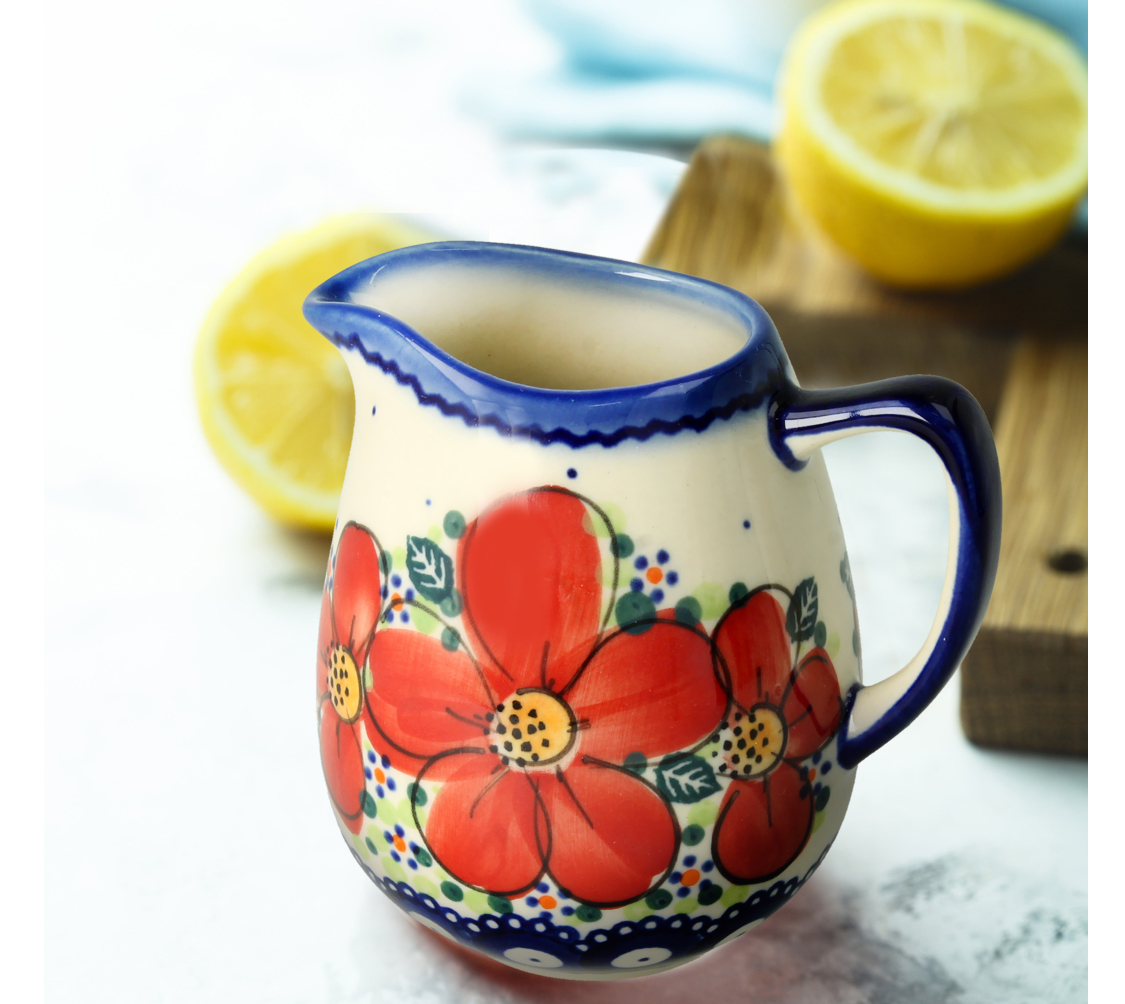 Mały dzbanek na mleko lub sok. Produkt ręcznie formowany i dekorowany w Zakładach Ceramicznych Bolesławiec.