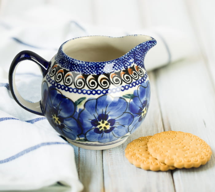 Mlecznik-dzbanuszek na mleko. Produkt ręcznie formowany i dekorowany w Zakładach Ceramicznych Bolesławiec.