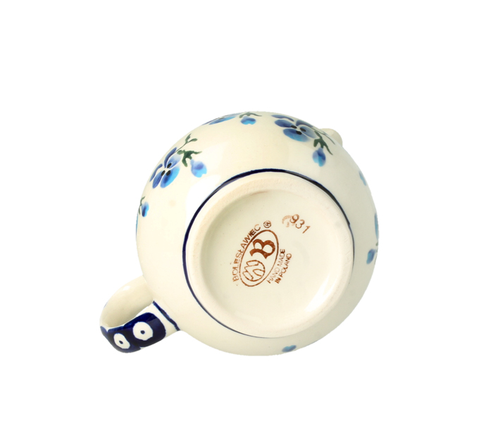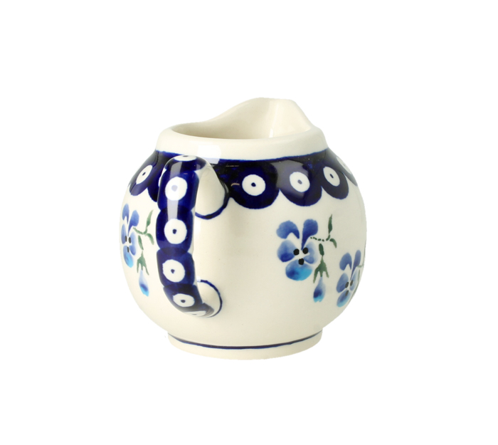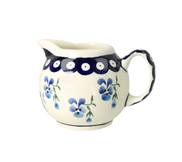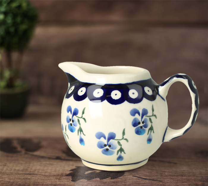 Mały, pękaty dzbanuszek do mleka. Produkt ręcznie formowany i dekorowany w Zakładach Ceramicznych Bolesławiec.