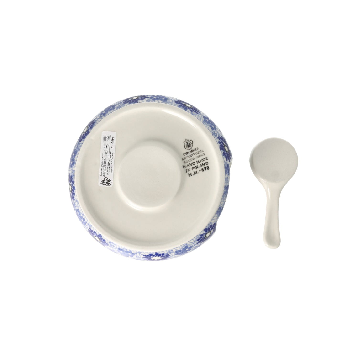 Cukiernica z uszkami i otworem na łyżeczkę. Produkt ręcznie formowany i dekorowany w Ceramice Artystycznej S.R.A. Bolesławiec.