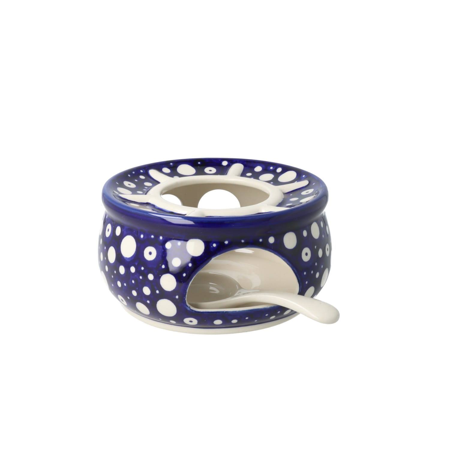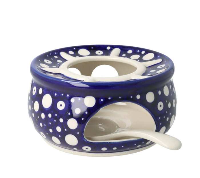Okrągły podgrzewacz, we wnętrzu którego należy umieścić świeczkę typu tealight, dzięki czemu napój w czajniku dłużej zachowa temperaturę.