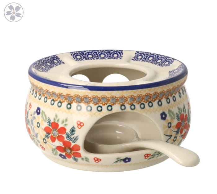 Okrągły podgrzewacz, we wnętrzu którego należy umieścić świeczkę typu tealight, dzięki czemu napój w czajniku dłużej zachowa temperaturę.