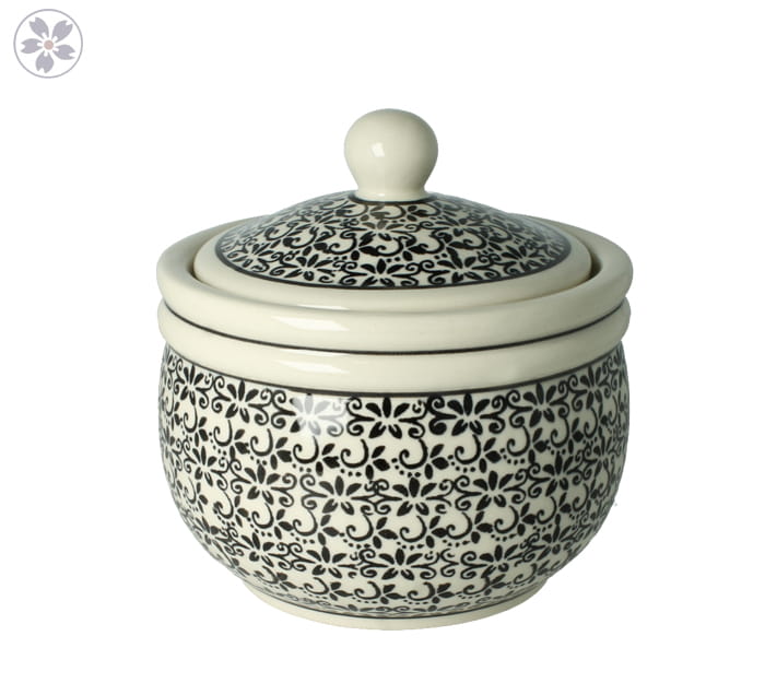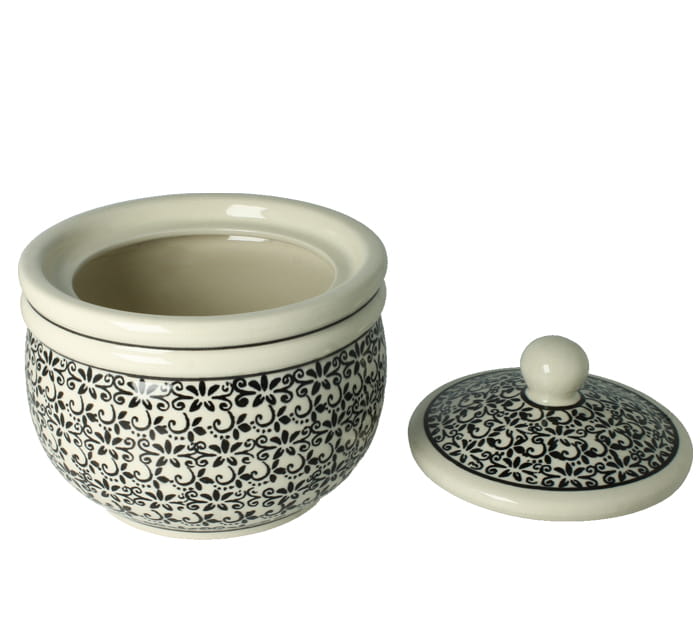 Okrągły pojemnik z pokrywką. Może służyć jako naczynie na przyprawy, herbatę lub kawę. świetnie sprawdzi się też jako pojemnik na przybory toaletowe.