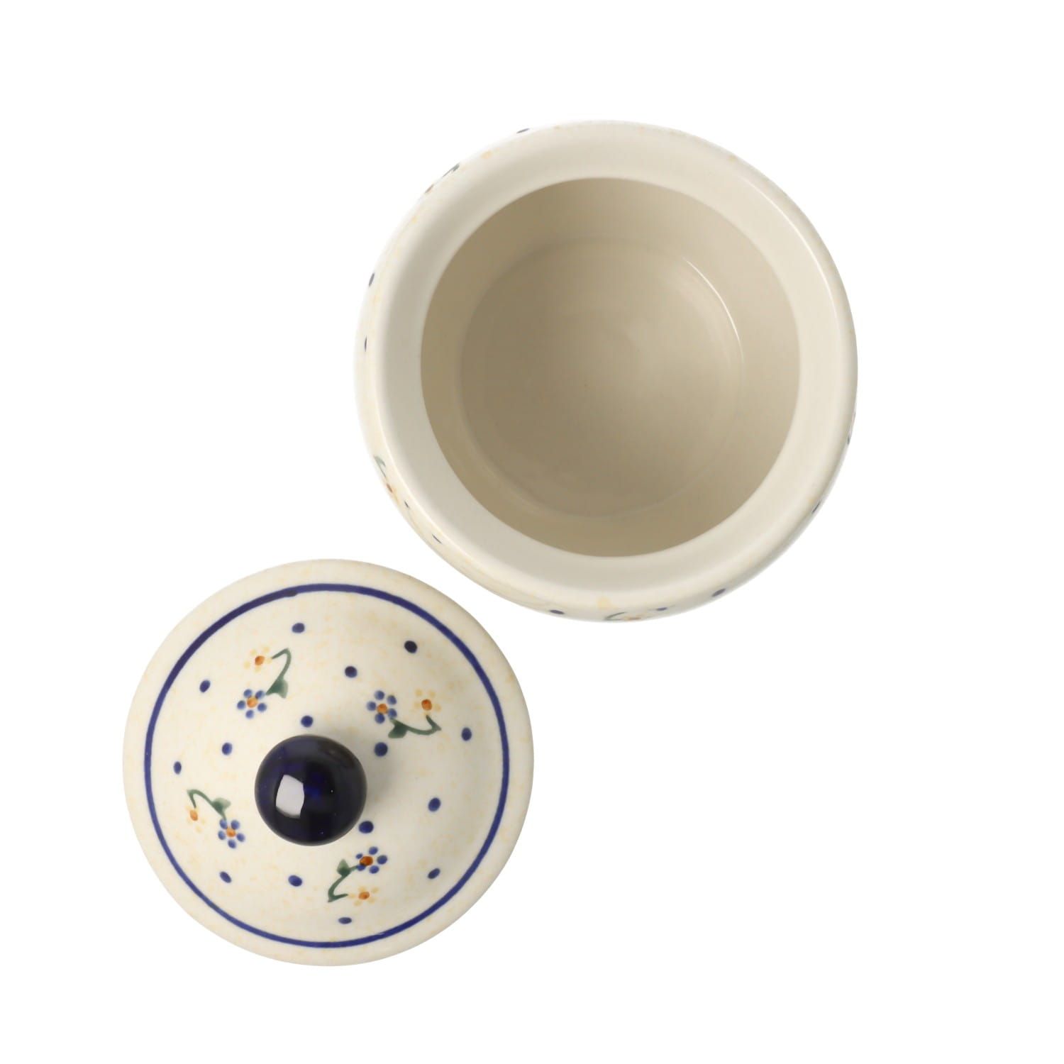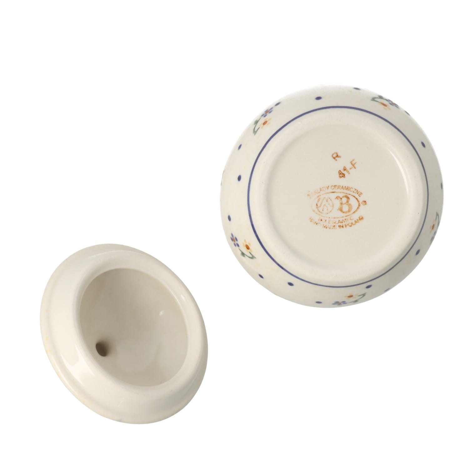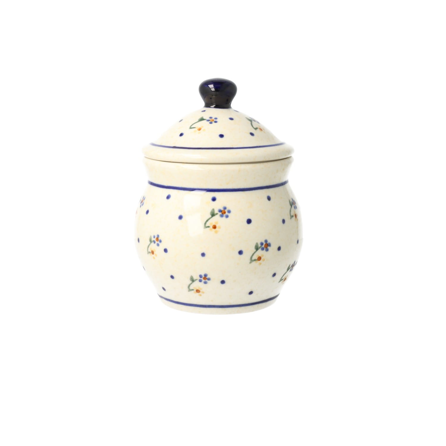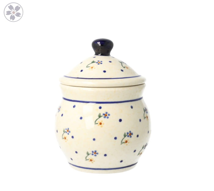 Mała, okrągła cukiernica z otworem na łyżeczkę. Produkt ręcznie formowany i dekorowany w Zakładach Ceramicznych Bolesławiec.
