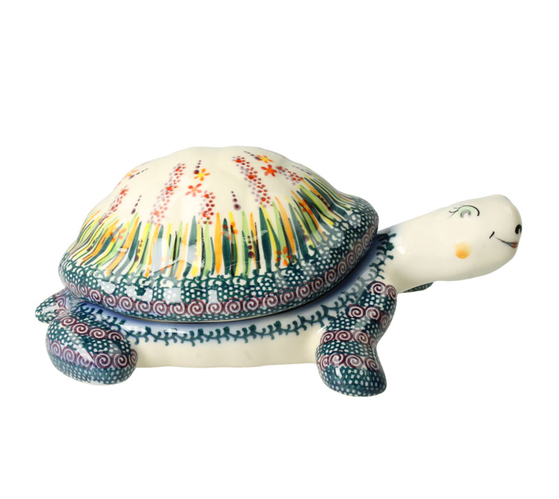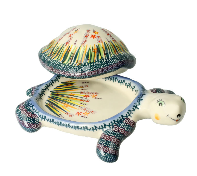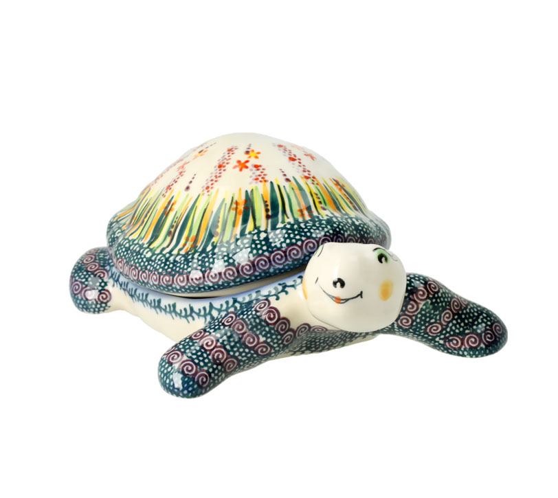 Pojemnik żółw, składający się z dwóch elementów: klosza w kształcie skorupy i podstawki.