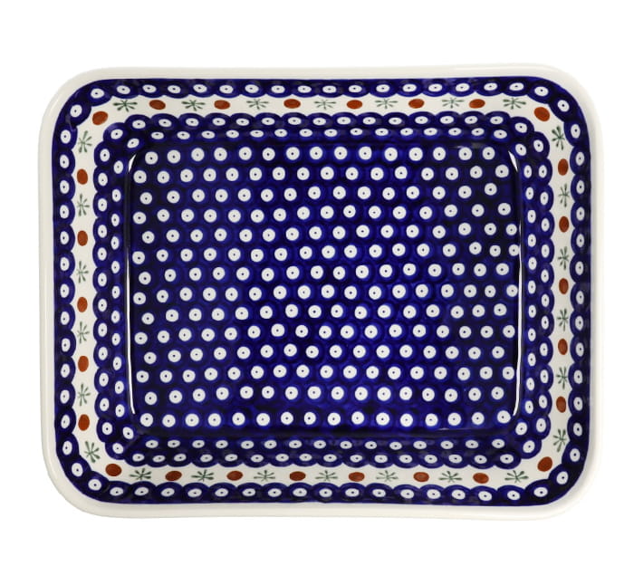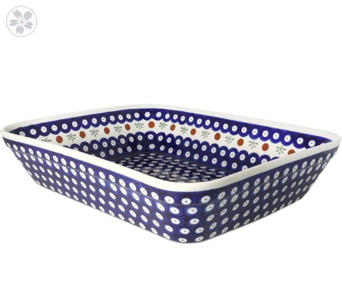 Prostokątny półmisek do zapiekania potraw. Produkt ręcznie formowany i dekorowany w Zakładach Ceramicznych Bolesławiec.