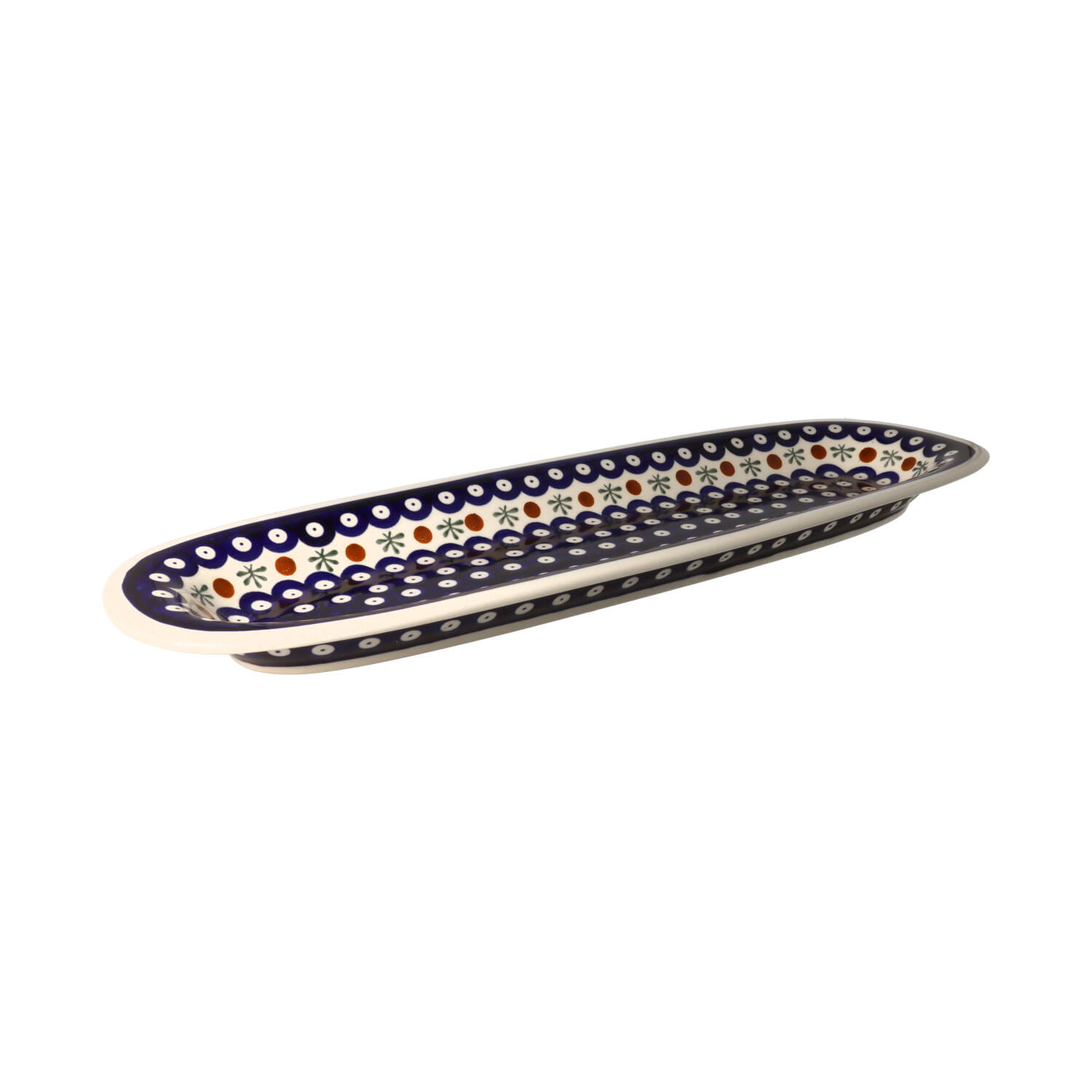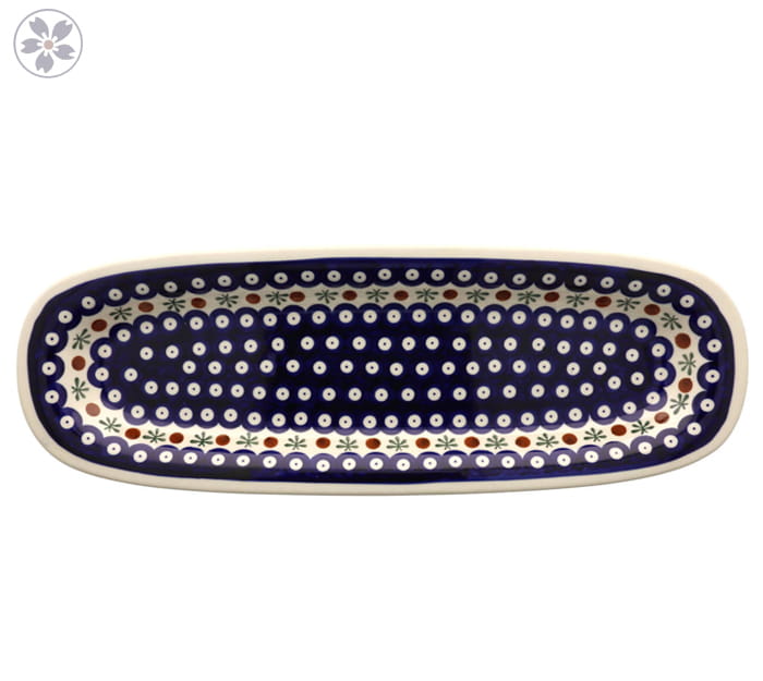Podłużna taca z podniesionym brzegiem. Produkt ręcznie formowany i dekorowany w Zakładach Ceramicznych Bolesławiec.