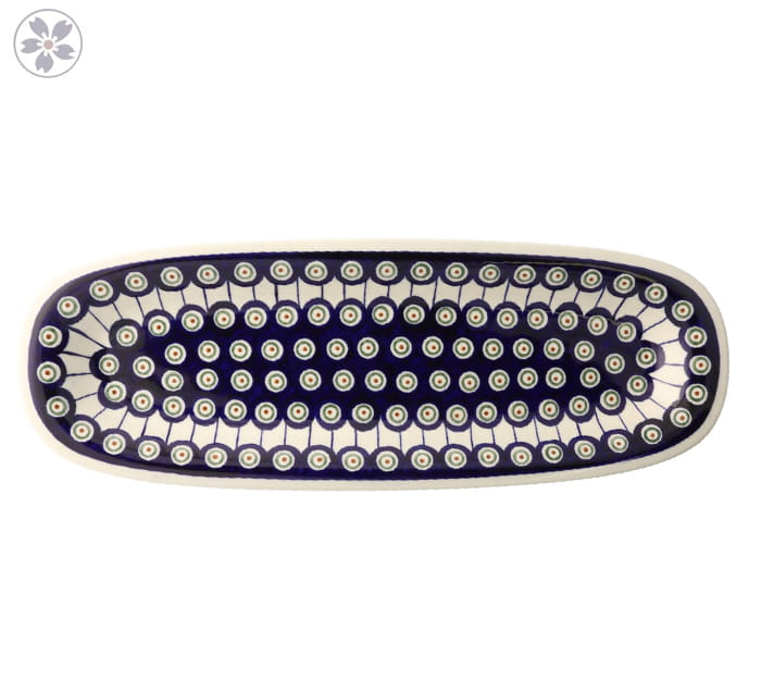 Podłużna taca z podniesionym brzegiem. Produkt ręcznie formowany i dekorowany w Zakładach Ceramicznych Bolesławiec.