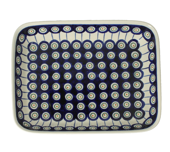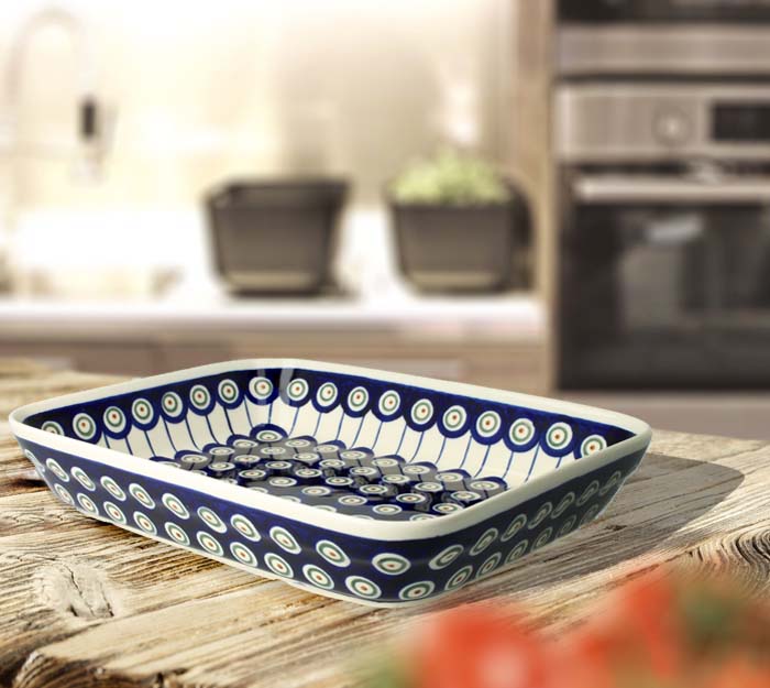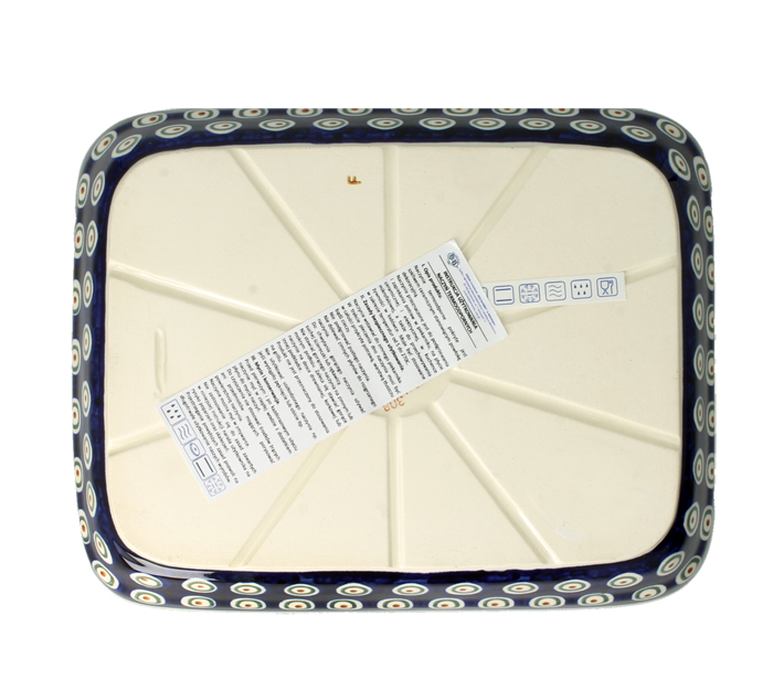 Prostokątny półmisek z rączkami, można w nim zapiekać i podgrzewać potrawy. Produkt ręcznie formowany i dekorowany w Zakładach Ceramicznych Bolesławiec.
