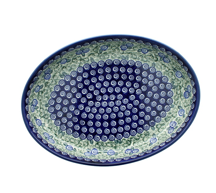 Duży, owalny półmisek do zapiekania lub podgrzewania. Produkt ręcznie formowany i dekorowany w Zakładach Ceramicznych Bolesławiec.