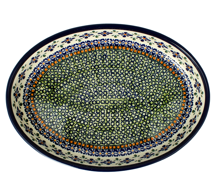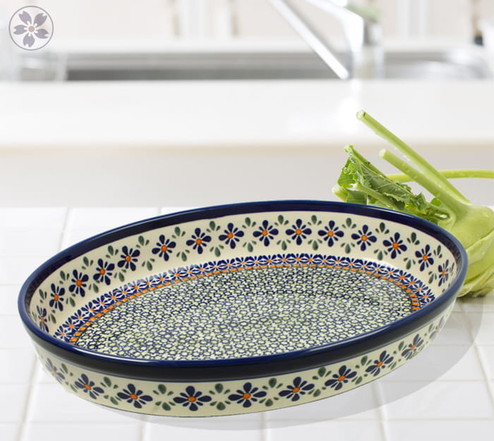 Owalny półmisek do zapiekania i podgrzewania potraw. Produkt ręcznie formowany i dekorowany w Zakładach Ceramicznych Bolesławiec.