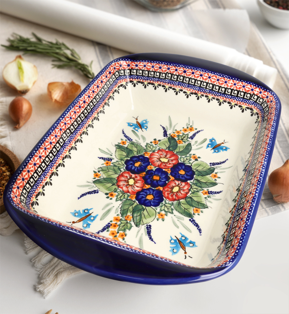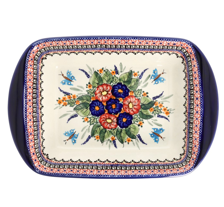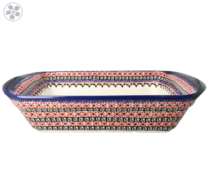 Prostokątny półmisek do zapiekania i podgrzewania. Produkt ręcznie formowany i dekorowany w Zakładach Ceramicznych Bolesławiec.