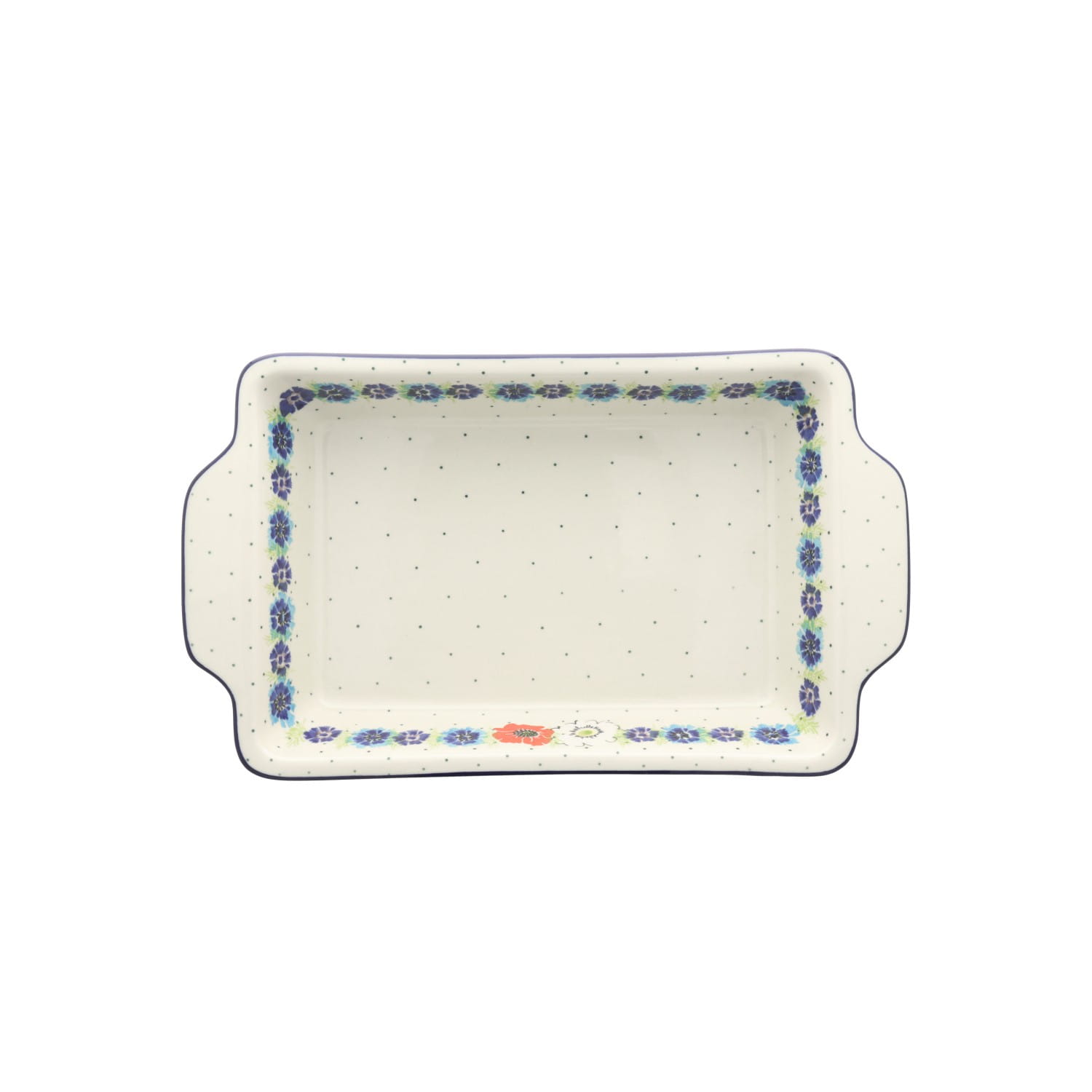 Okrągły rondel z uchwytami. Produkt ręcznie formowany i dekorowany w Ceramice Artystycznej S.R.A. Bolesławiec.