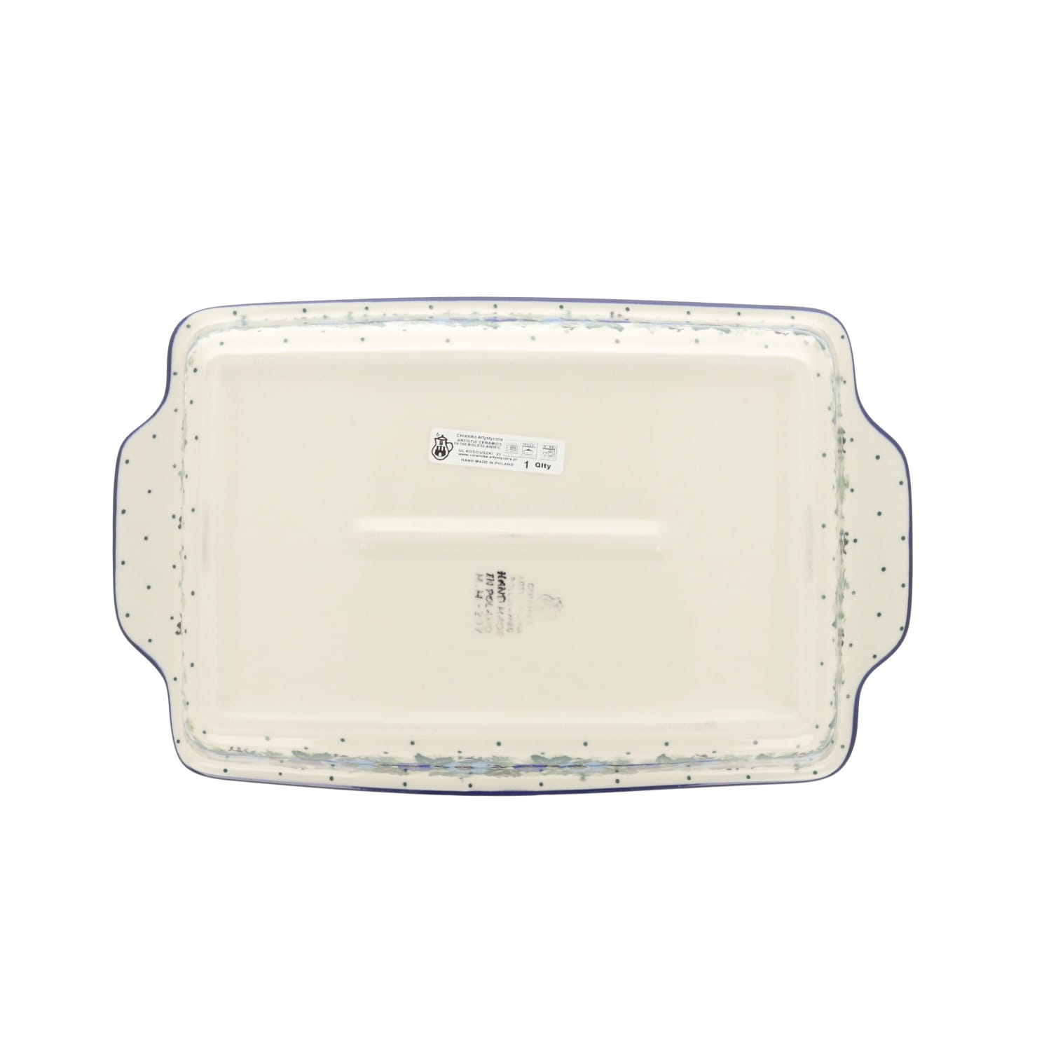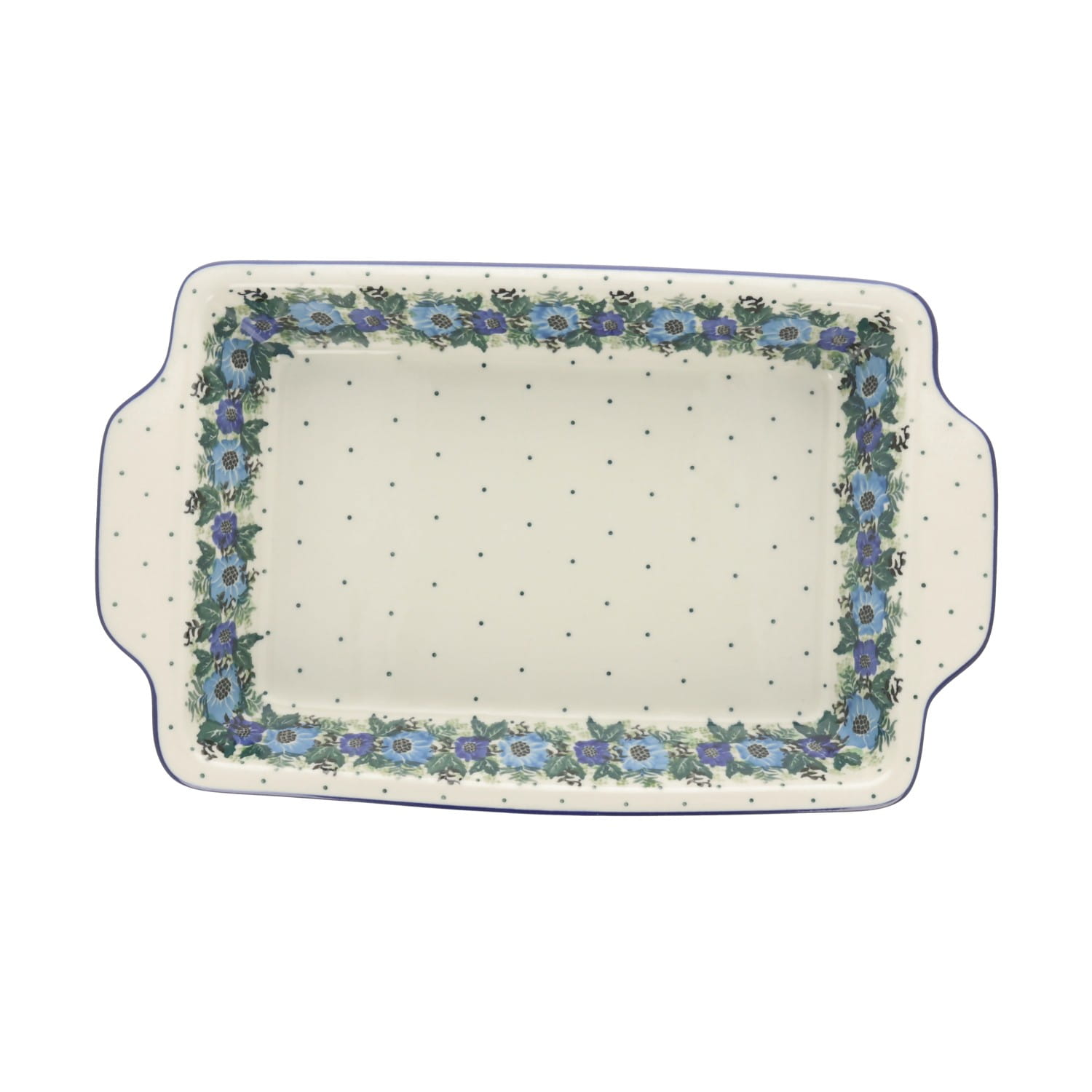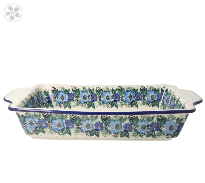 Prostokątna forma do pieczenia z uchwytami. Produkt ręcznie formowany i dekorowany w Ceramice Artystycznej S.R.A. Bolesławiec.