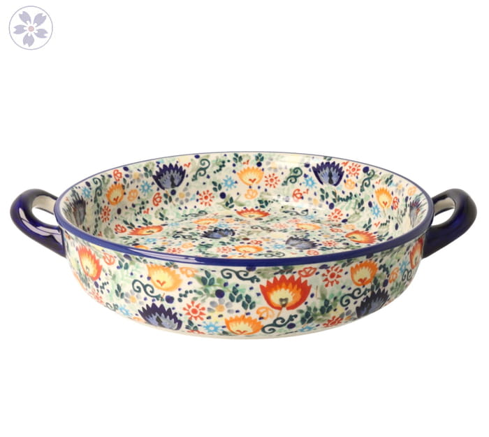 Okrągła forma z uchwytami, z motywem roślinnym. Sprawdzi się jako uniwersalne naczynie do pieczenia i zapiekania ciast, makaronów czy tart