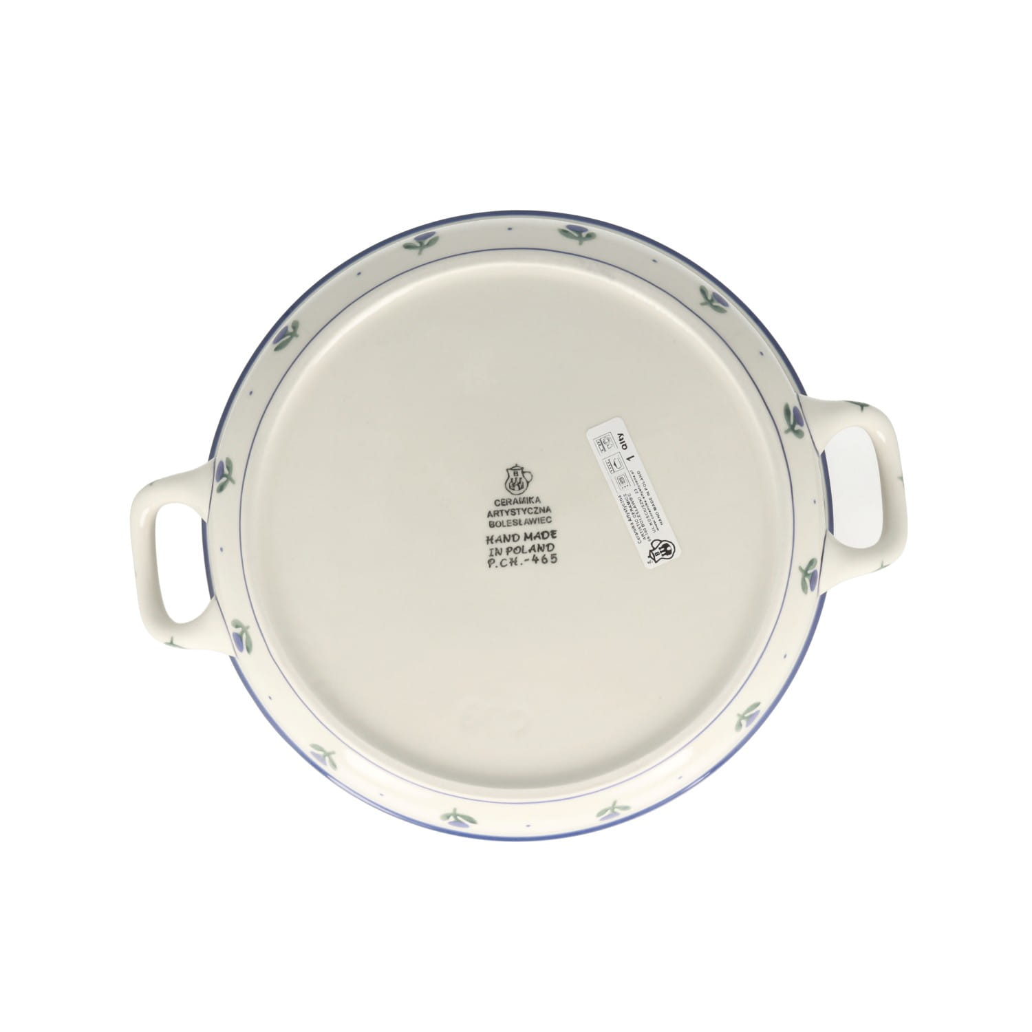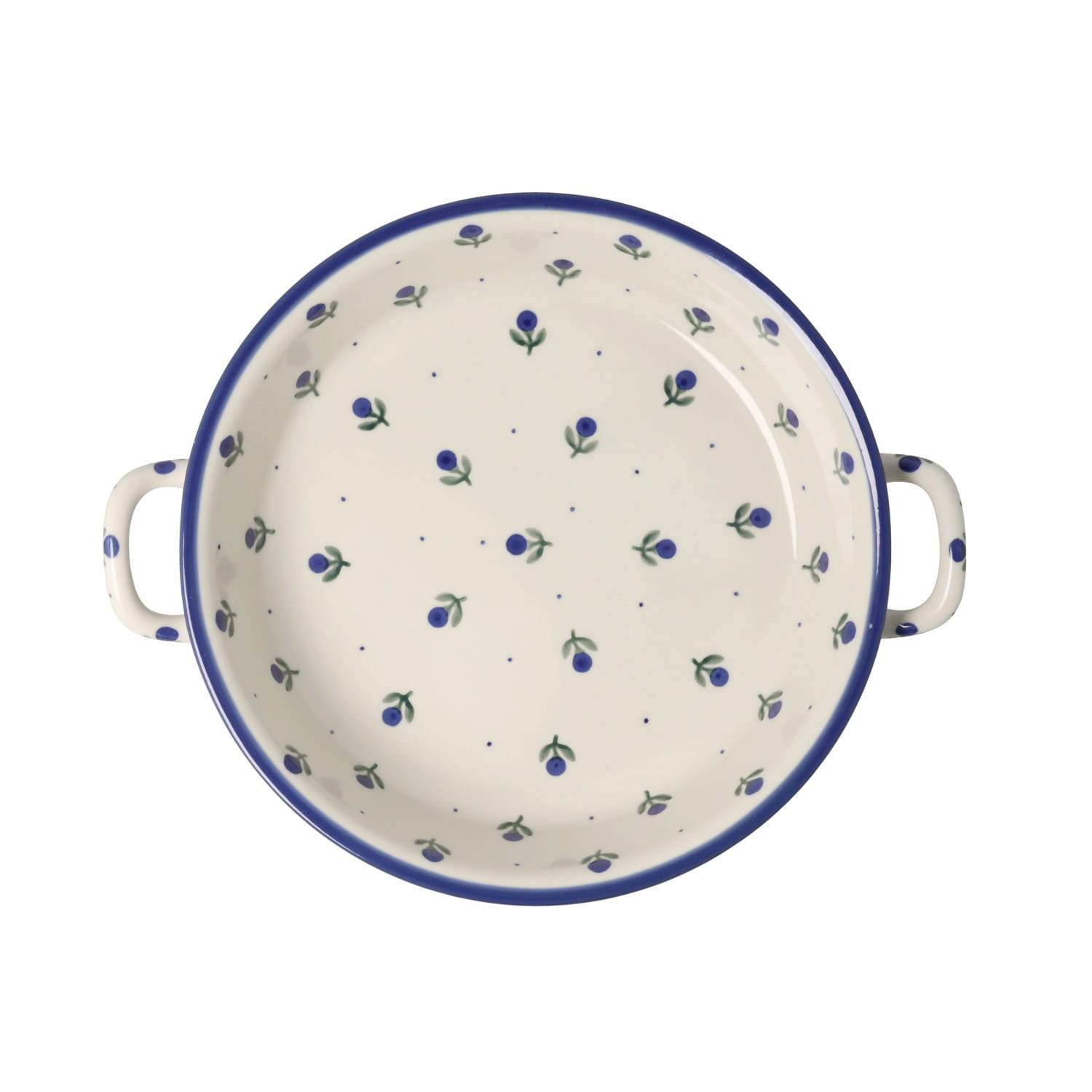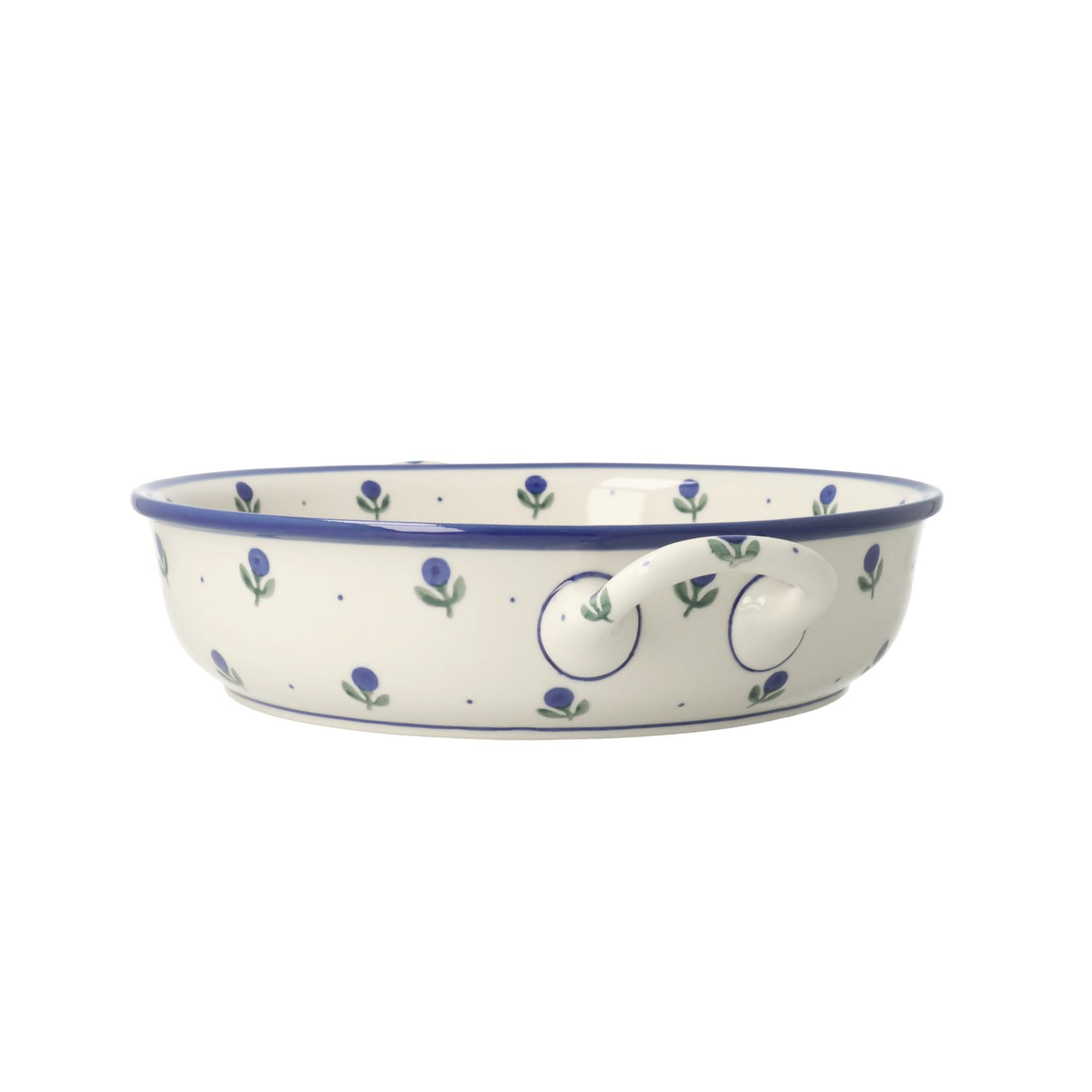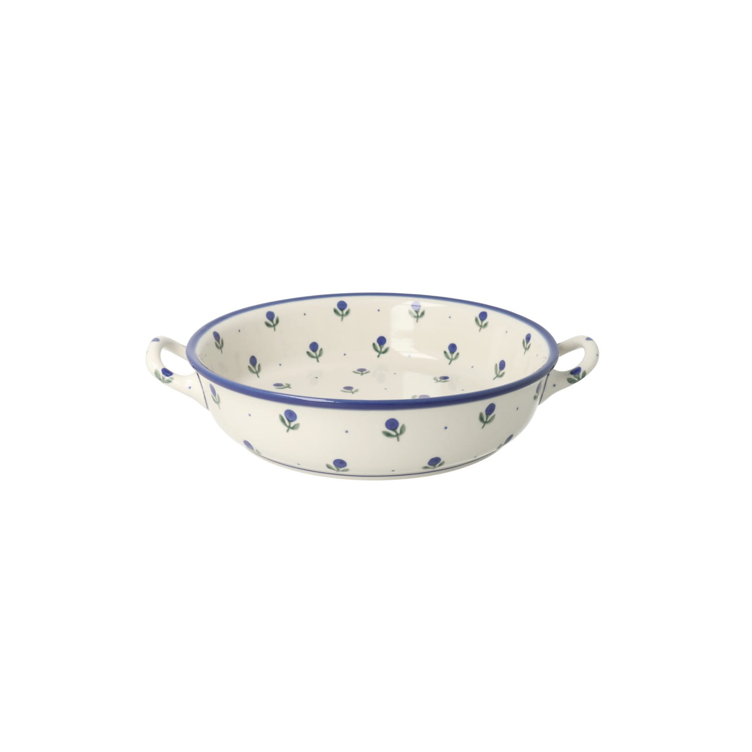 Okrągła forma z uchwytami, z motywem kwiatów. Sprawdzi się jako uniwersalne naczynie ciast, makaronów czy tart.
