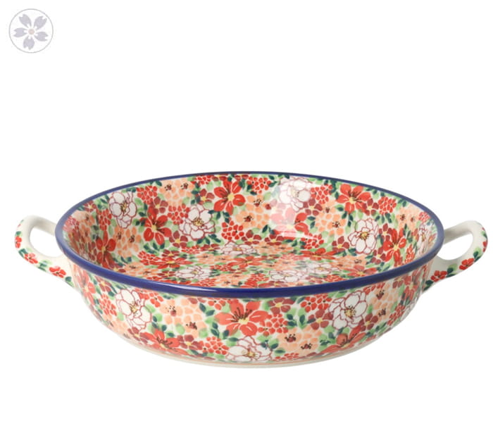 Okrągła forma z uchwytami. Sprawdzi się jako uniwersalne naczynie ciast, makaronów czy tart.