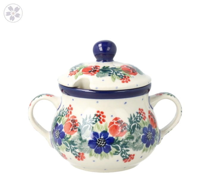 Cukiernica z uszkami i otworem na łyżeczkę. Produkt ręcznie formowany i dekorowany w Ceramice Artystycznej S.R.A. Bolesławiec.