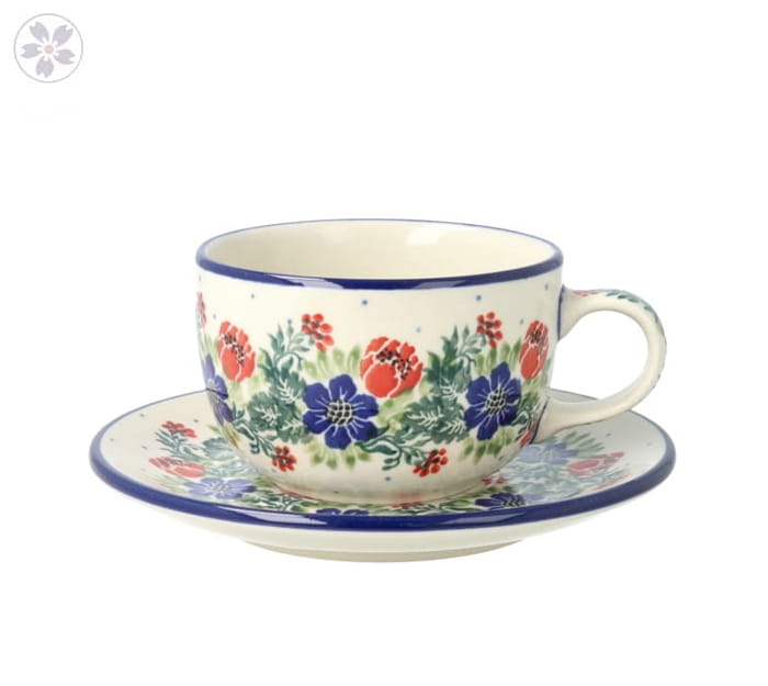 Filiżanka z profilowanym uchem oraz spodkiem. Produkt ręcznie formowany i dekorowany w Ceramice Artystycznej S.R.A. Bolesławiec.