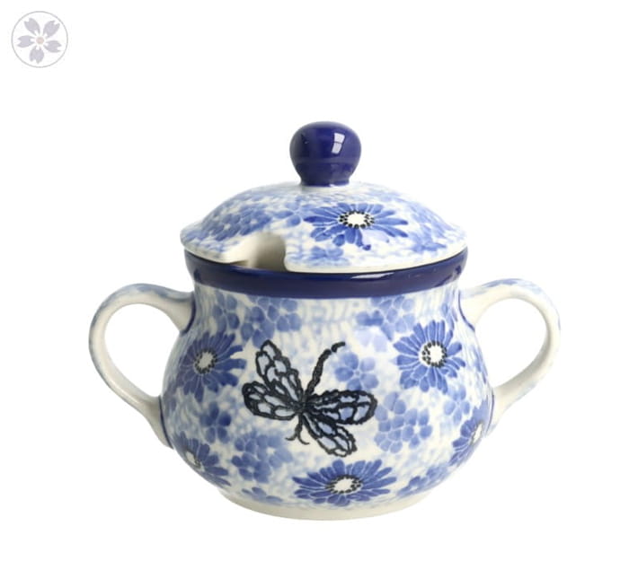 Cukiernica z uszkami i otworem na łyżeczkę. Produkt ręcznie formowany i dekorowany w Ceramice Artystycznej S.R.A. Bolesławiec.