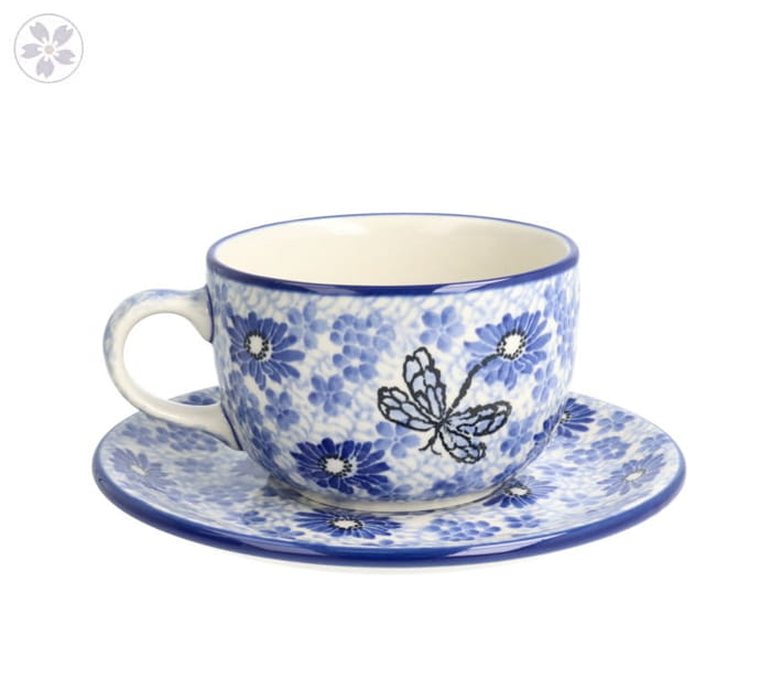 Zestaw filiżanka ze spodkiem i talerz. Produkt ręcznie formowany i dekorowany w Ceramice Artystycznej S.R.A. Bolesławiec.