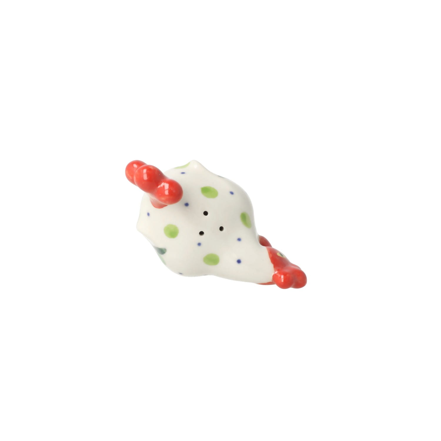 Solniczka w kształcie kurki, ma trzy otwory na grzbiecie i plastikowy korek na spodzie.