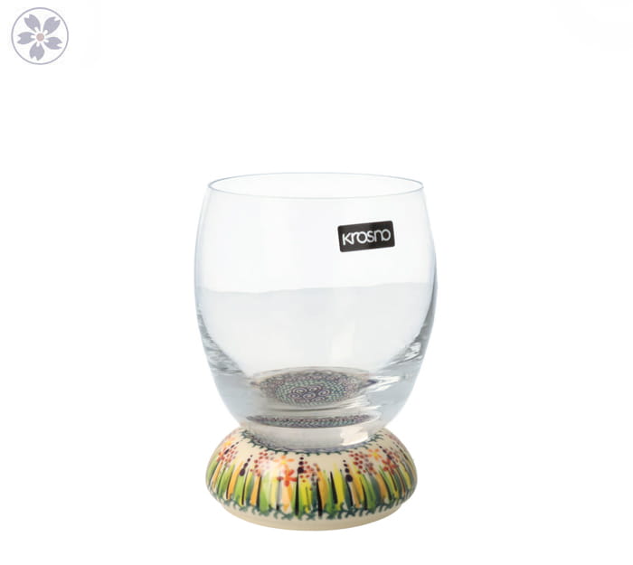 Szklanka- kielich na stopce ceramicznej stworzony do degustacji napojów bezalkoholowych oraz alkoholowych. Połączenie szklanej czarki kieliszka z ręcznie malowaną, ceramiczną nóżką, nadaje mu niepowtarzalnego uroku. Eleganckie i praktyczne naczynia przydadzą się w każdym domu. Używane jako część zastawy stołowej lub samodzielny prezent. Odkryj przyjemność z posiadania bolesławieckiej ceramiki i stwórz własną kolekcję.