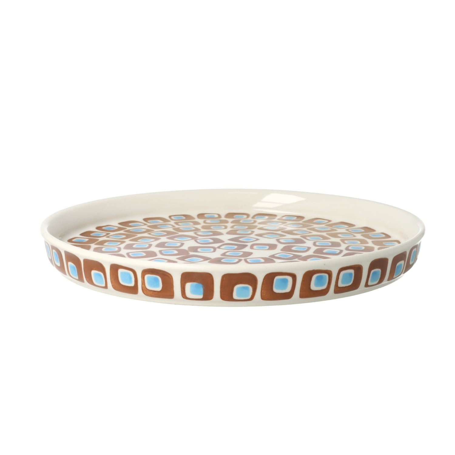 Okrągła taca z rantem. Odpowiednia do podawania przekąsek, ciast, śniadań czy kolacji.