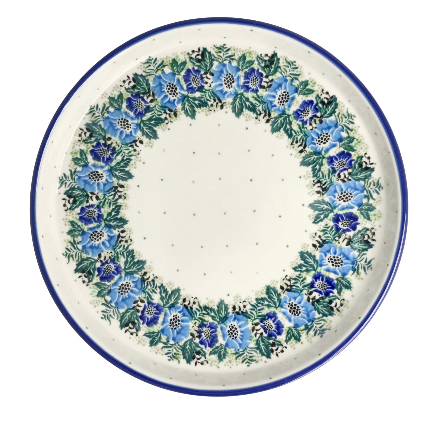 Okrągły, płaski talerz. Produkt ręcznie formowany i dekorowany w Ceramice Artystycznej S.R.A. Bolesławiec.