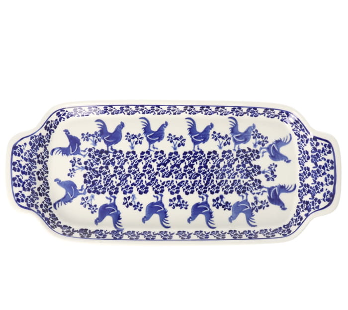 Podłużna taca z uchwytami. Produkt ręcznie formowany i dekorowany w Zakładach Ceramicznych Bolesławiec.