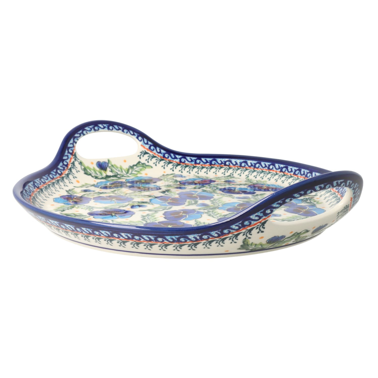 Podłużna taca z uchwytami i podniesionym brzegiem. Produkt ręcznie formowany i dekorowany w Zakładach Ceramicznych Bolesławiec.