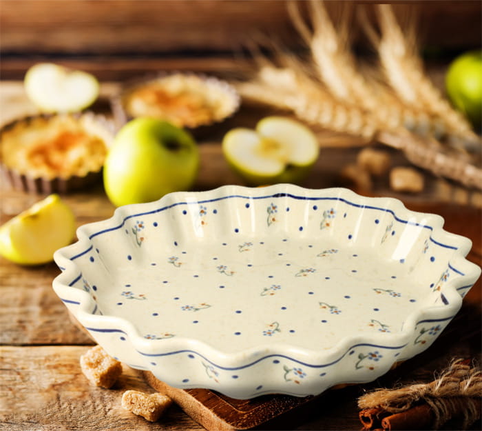 Okrągły talerz-taca z podniesionym, falistym brzegiem, odpowiedni do podawania i przechowywania ciast i przekąsek. Naczynie posiada ryflowane dno i jest przystosowane do zapiekania i podgrzewania potraw do temperatury 280° C w tradycyjnych piekarnikach gazowych i elektrycznych, na płytach szklano - ceramicznych oraz elektrycznych płytach stałych.