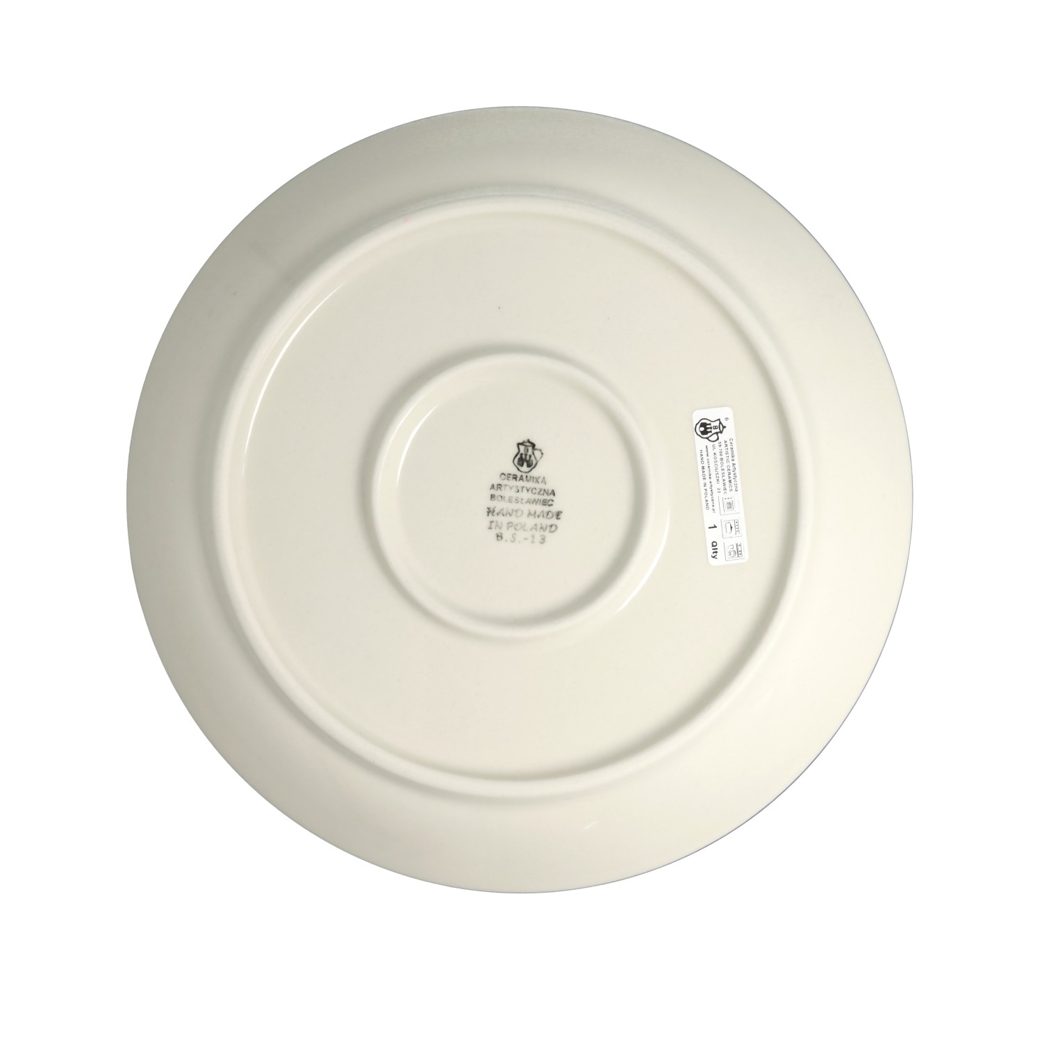 Duży, płaski talerz obiadowy. Produkt ręcznie formowany i dekorowany w Ceramice Artystycznej S.R.A. Bolesławiec.