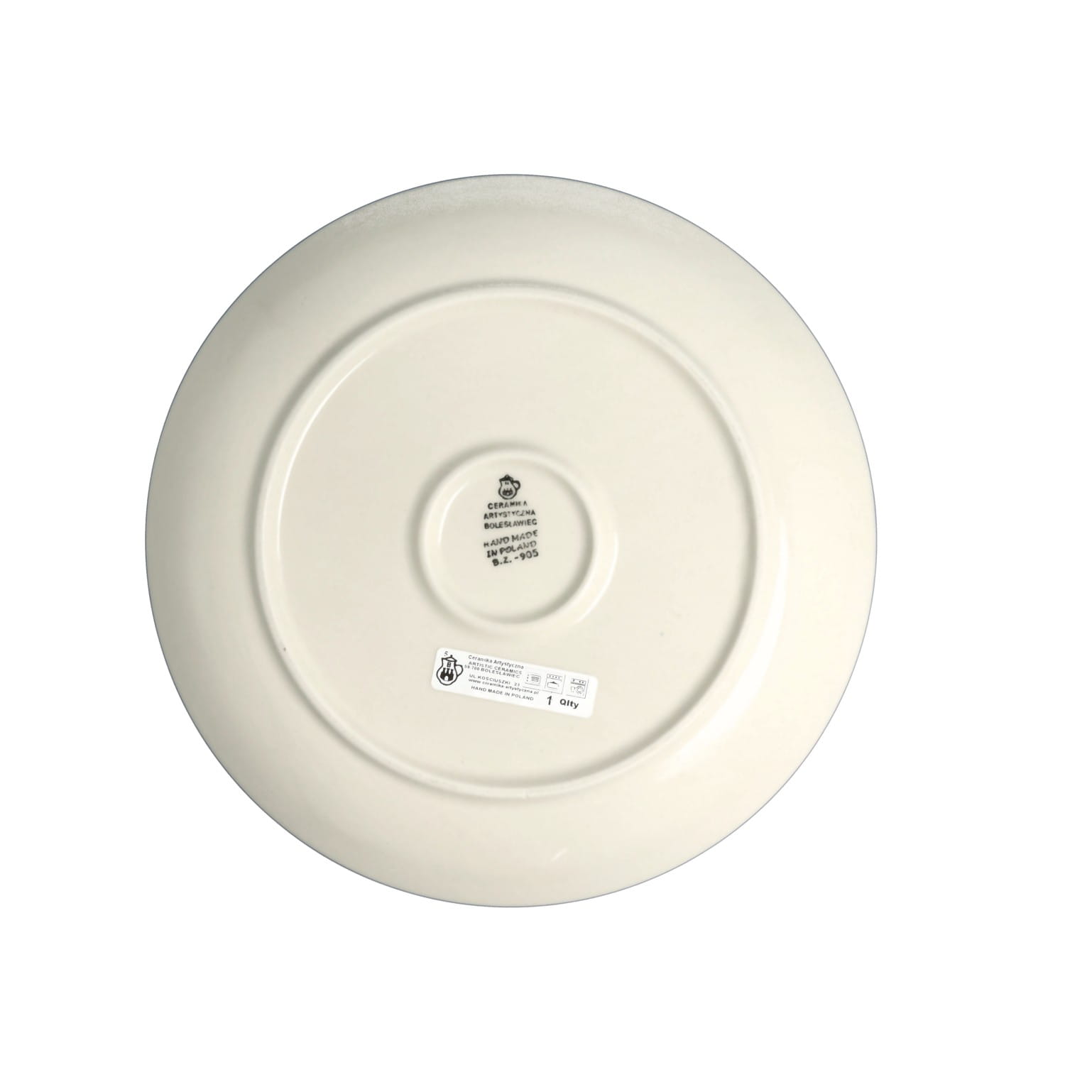 Okrągły, płaski talerz. Produkt ręcznie formowany i dekorowany w Ceramice Artystycznej S.R.A. Bolesławiec.