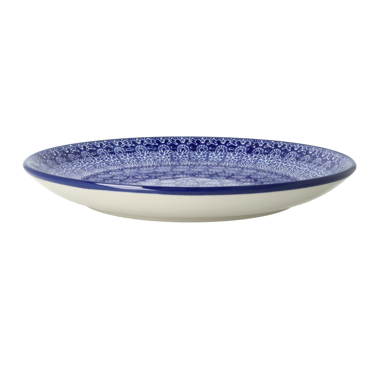 Płaski talerz deserowy. Produkt ręcznie formowany i dekorowany w Ceramice Artystycznej S.R.A. Bolesławiec.