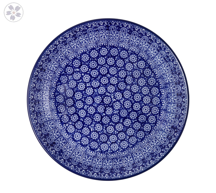 Płaski talerz obiadowy. Produkt ręcznie formowany i dekorowany w Ceramice Artystycznej S.R.A. Bolesławiec.