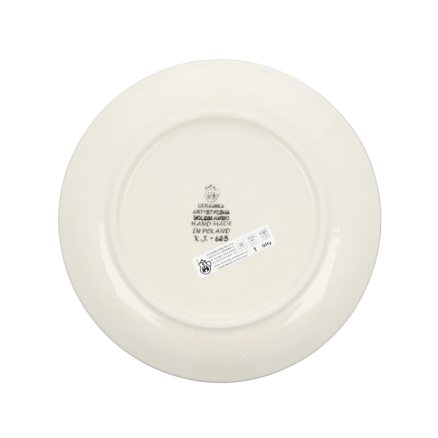 Okrągły, płaski talerz. Produkt ręcznie formowany i dekorowany w Ceramice Artystycznej S.R.A. Bolesławiec.